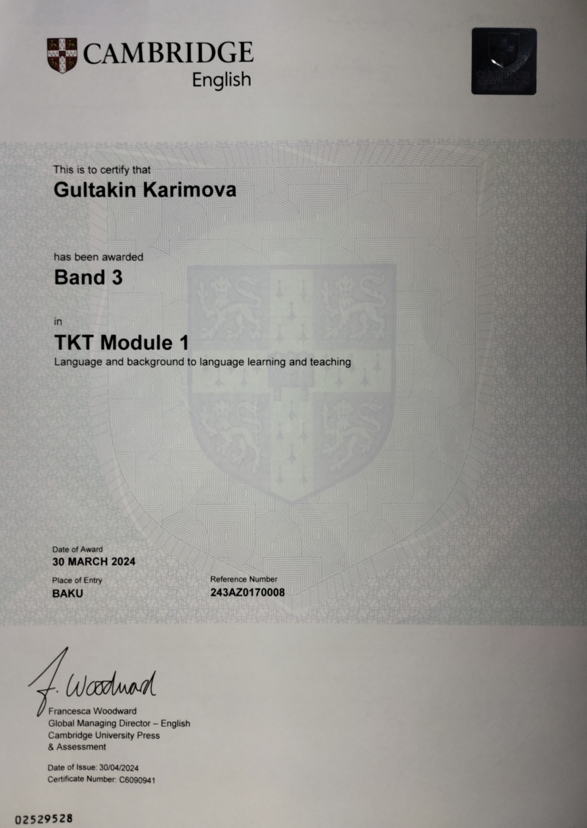 Mən 3 ildən artıq təcrübəyə malik ixtisaslı ingilis dili müəllimiyəm. Özəl liseydə və dil məktəbində dərs demişəm. Cambridge TKT (Teaching Knowledge Test) sertifikatı və TEFL (Teaching English as a Foreign Language) sertifikatına sahibəm. Karyeram boyunca fərqli yaş və səviyyədə olan tələbələrlə çalışaraq onların ingilis dili bacarıqlarını inkişaf etdirməyə kömək etmişəm.