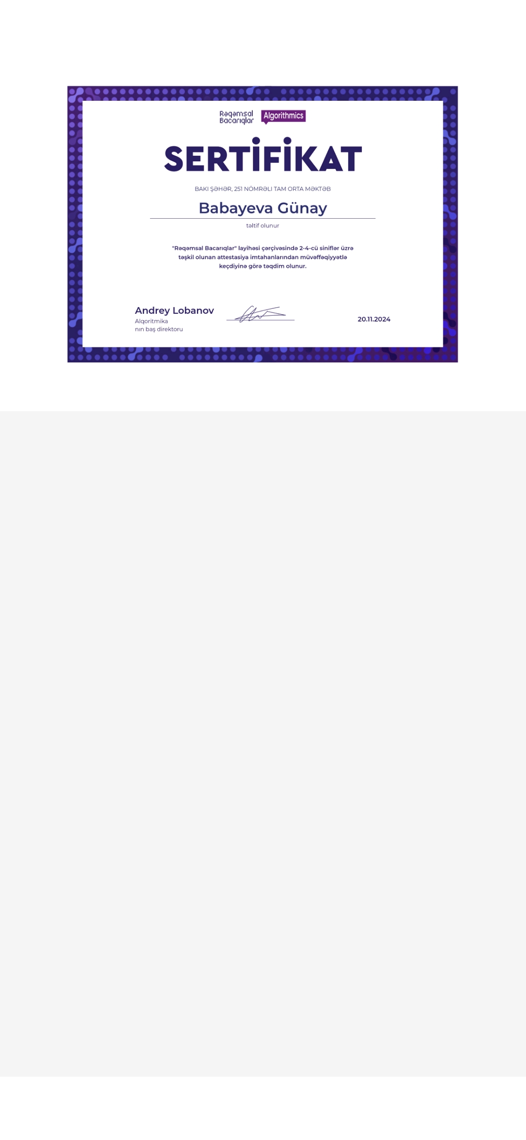 Azerbaycan Universiteti bitirmişəm( Rus bölməsi)ixtisasım riyaziyyat və informatika müəllimi. Şən, gülərüz repetitor. Uşaqlar ile işləmək çox sevirəm. İbtidai sinif ve 5-11 sinif şagirdləri (rus. b) riyaziyyat, informatika və alqoritmika üçün müraciət edə bilərsiniz