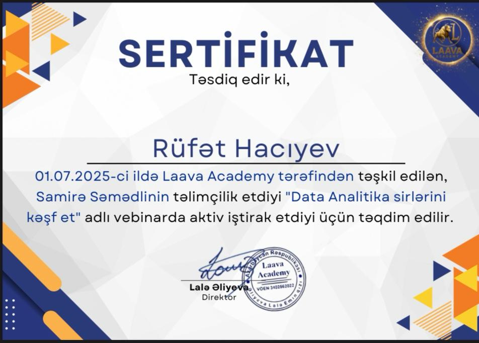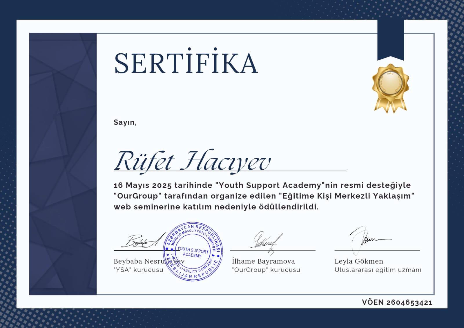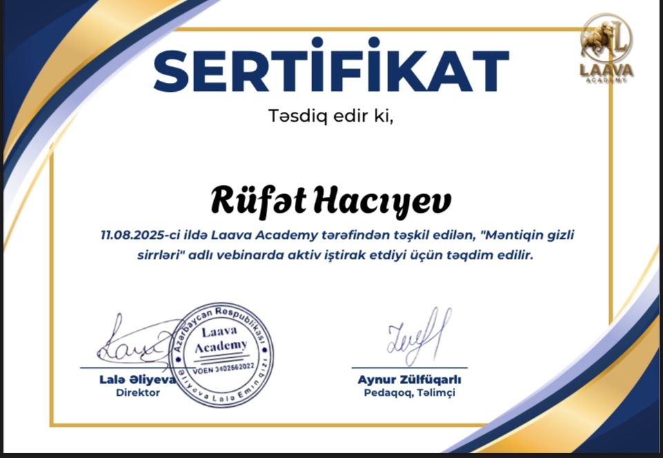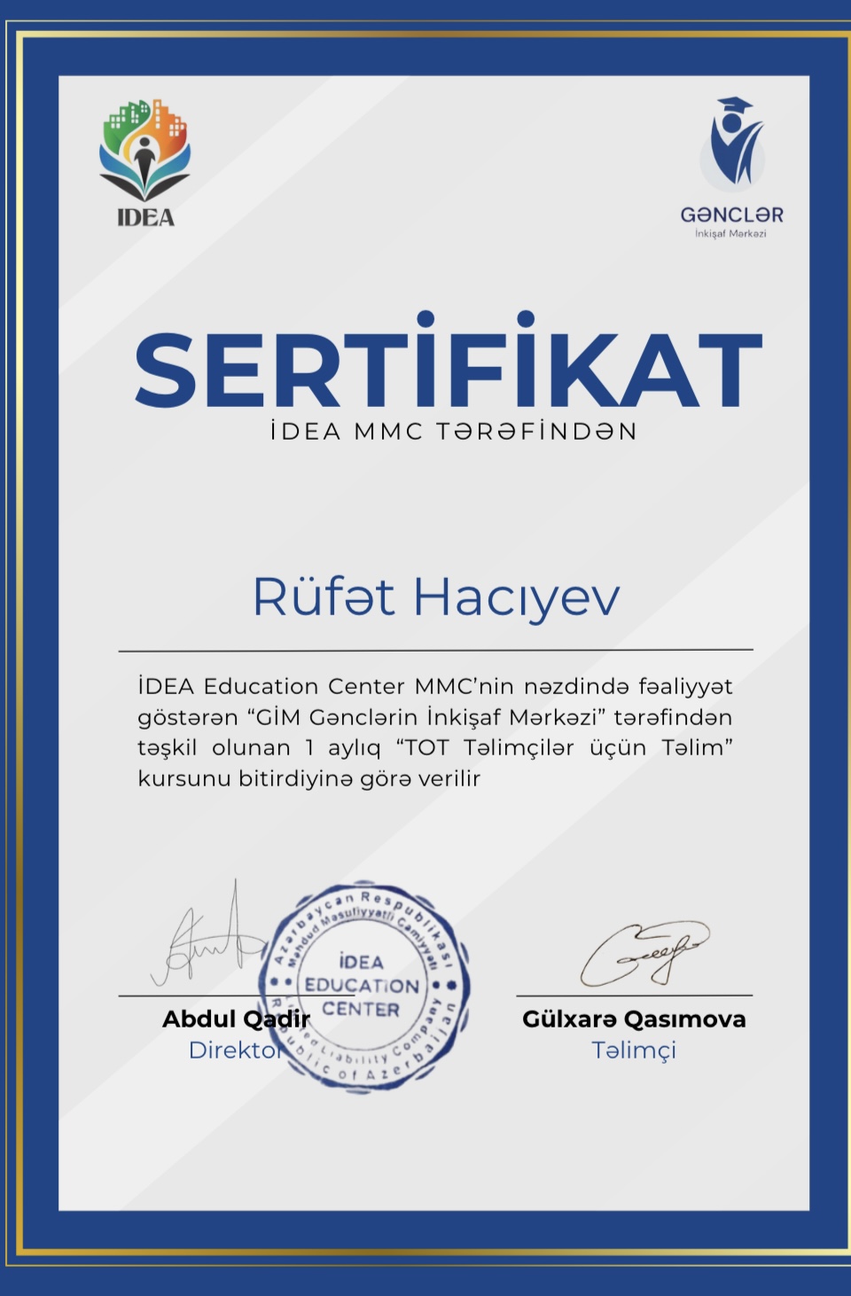 Oglumun hem ingilis dili muellimi hem de mentiq muellimidir. Oglumun Ingilis dili biliyi cox zeif olsa da cox qisa zamanda artiq oglum ingilis dilinde xeyli irelileyis elde edib Rufet muellim sayesinde. Ders prosesi semimi ve eylenceli kecir. Azyaslilarin dersde xususende online dersde derse celb edilmesi cetin olsa da oglum ders prosesinde hec sixilmir. Mentiq dersi de eyni derecede maraqli ve semereli kecir.
