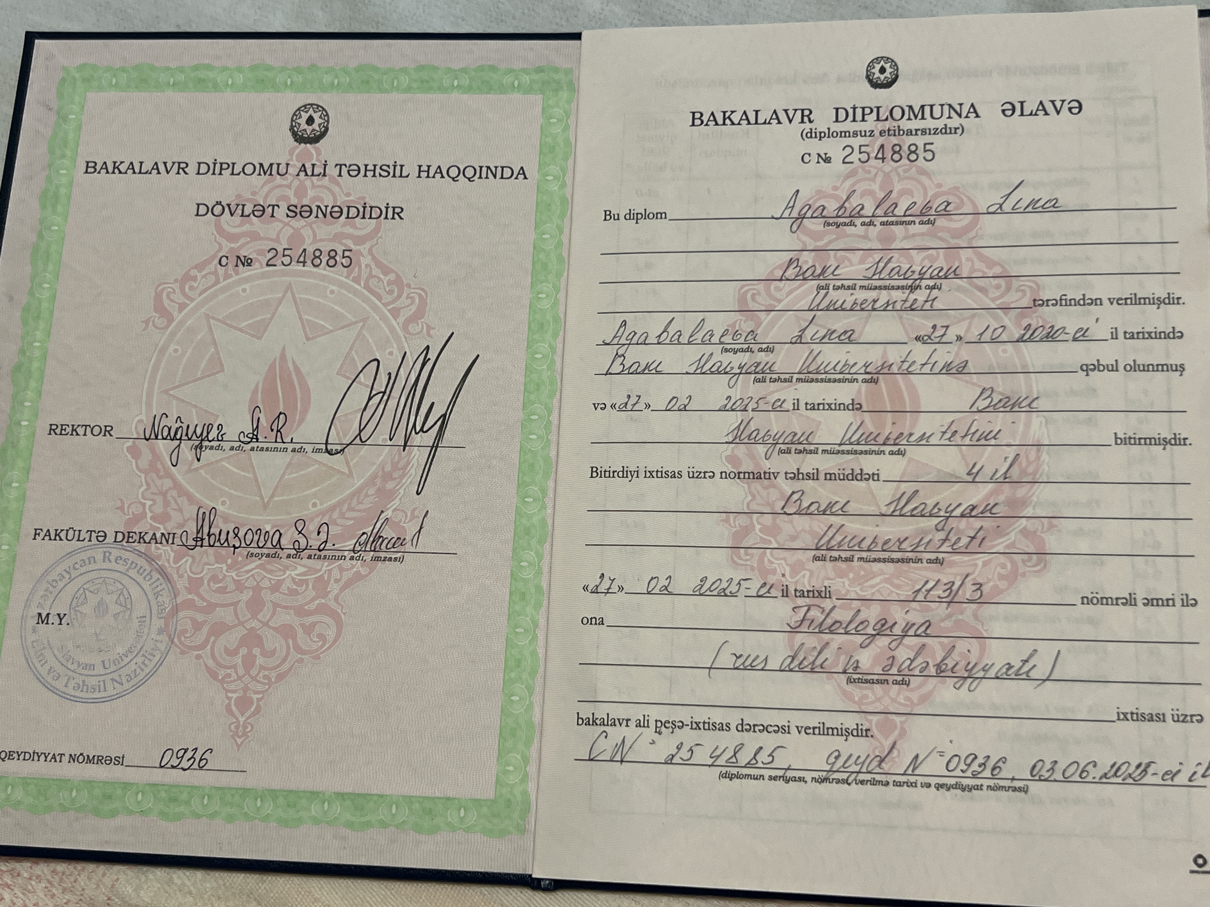 Привет! Я Лина . Филолог русского языка и литературы . Окончила Бакинский Славянский Университет . Работала в различных подготовительных курсах , буду рада наставлять и сделаю все возможное , чтобы научить русский язык.В своей работе я использую современные методики преподавания, включая коммуникативный подход, проектное обучение и интерактивные занятия. Мои уроки направлены на развитие всех аспектов языка: говорения, письма, чтения и аудирования.
