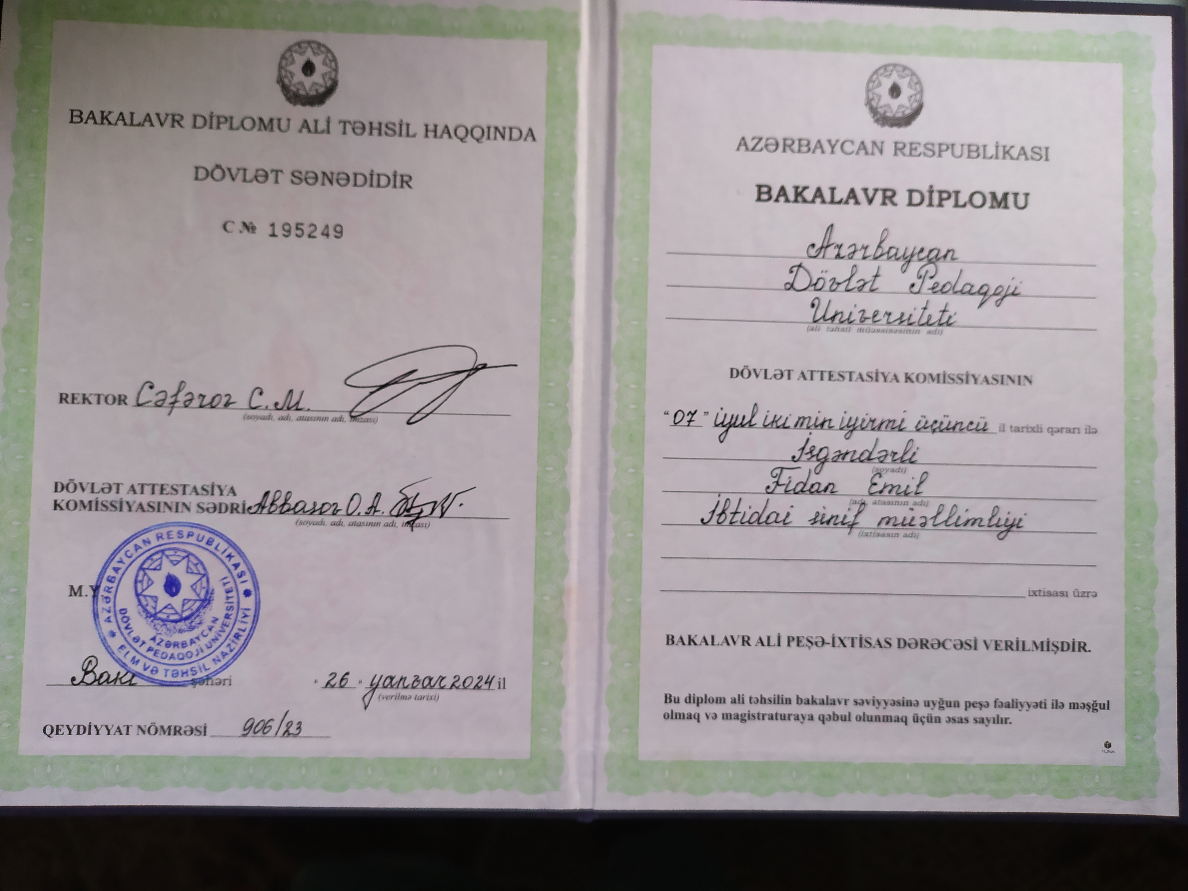Mən İsgəndərli Fidan 2023-cu ildə Azərbaycan Dövlət Pedaqoji Universitetini bitirmişəm.İbtidai sinif müəllimliyi üzrə təhsil müəssisəsində çalışıram . Repetitor hazırlığı üzrə online və əyani hazırlıq qruplarım mövcuddur .Dərslər individual və qruplar şəklində tədris edilir.Dərslər yüksək səviyyədə izah edilir və Zoom proqrami vasitəsilə dərslər tədris edilir.Maraqlanmaq istəyən kəslər əlaqə qura bilərler .