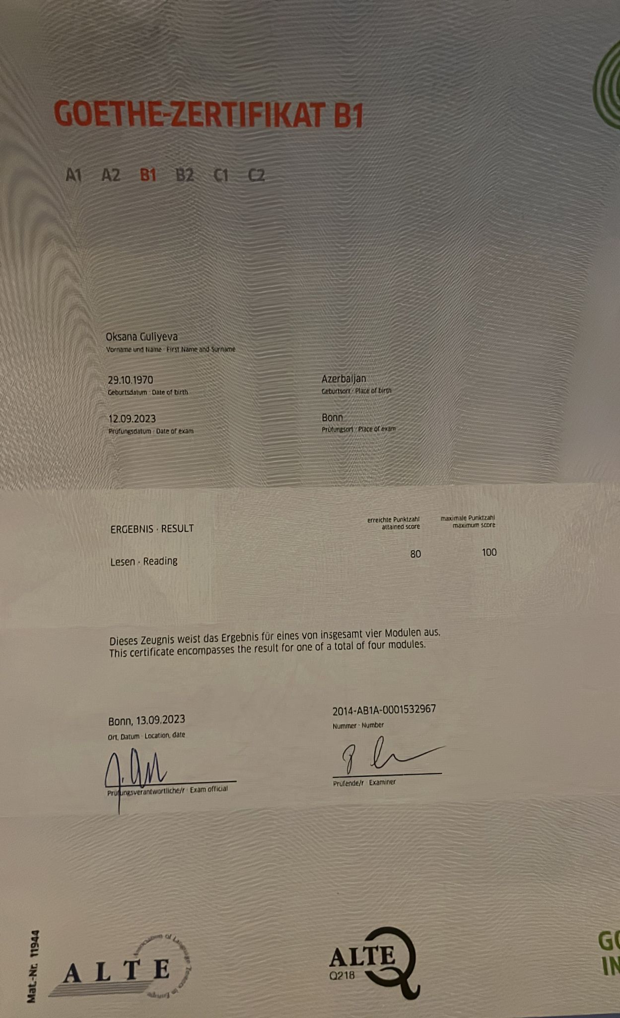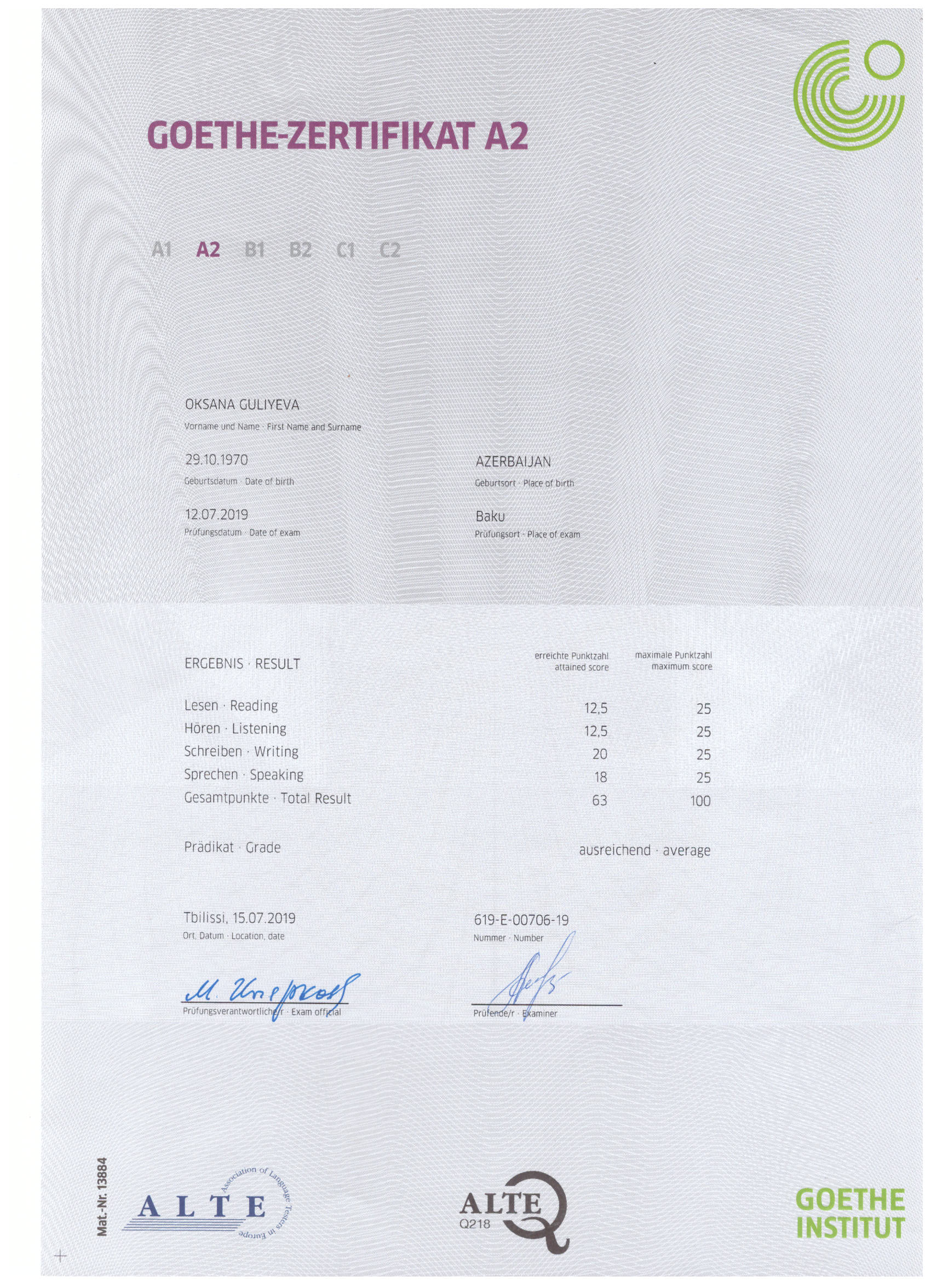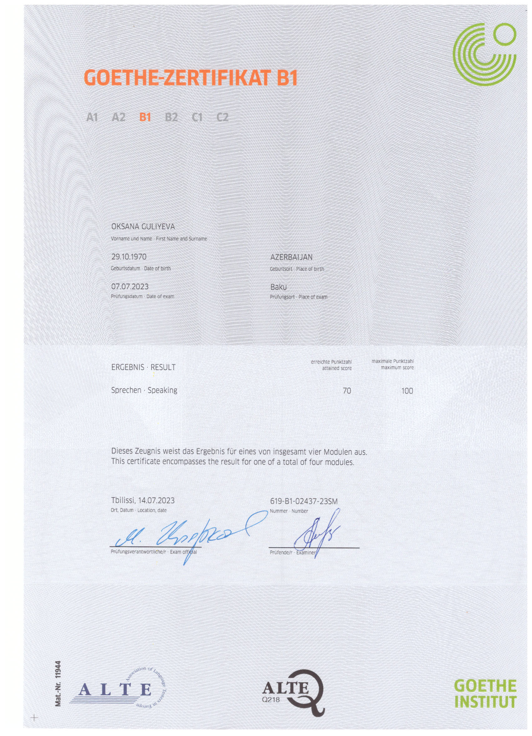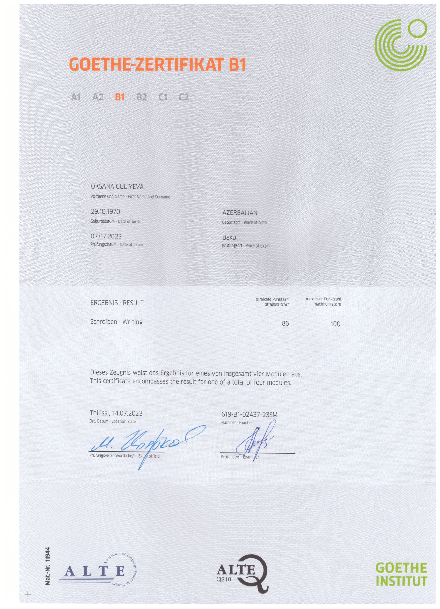 Mən Alman dili C1 sertifikatına sahibəm və Alman, İngilis dili və FSP tədris edirəm. Mən Türkiyə'də Alman dili və ədəbiyyatı təhsilimi 2018- ci ildə bitirdikdən sonra 4 il boyunca Almanya və Türkiyədə müəllim və tərcüməçi kimi işləmişəm. Artıq 6 illik Alman dili müəllimlik təcrübəm var. Əlavə olaraq həmçinin İngilis dilini də mükəmməl bir şəkildə d