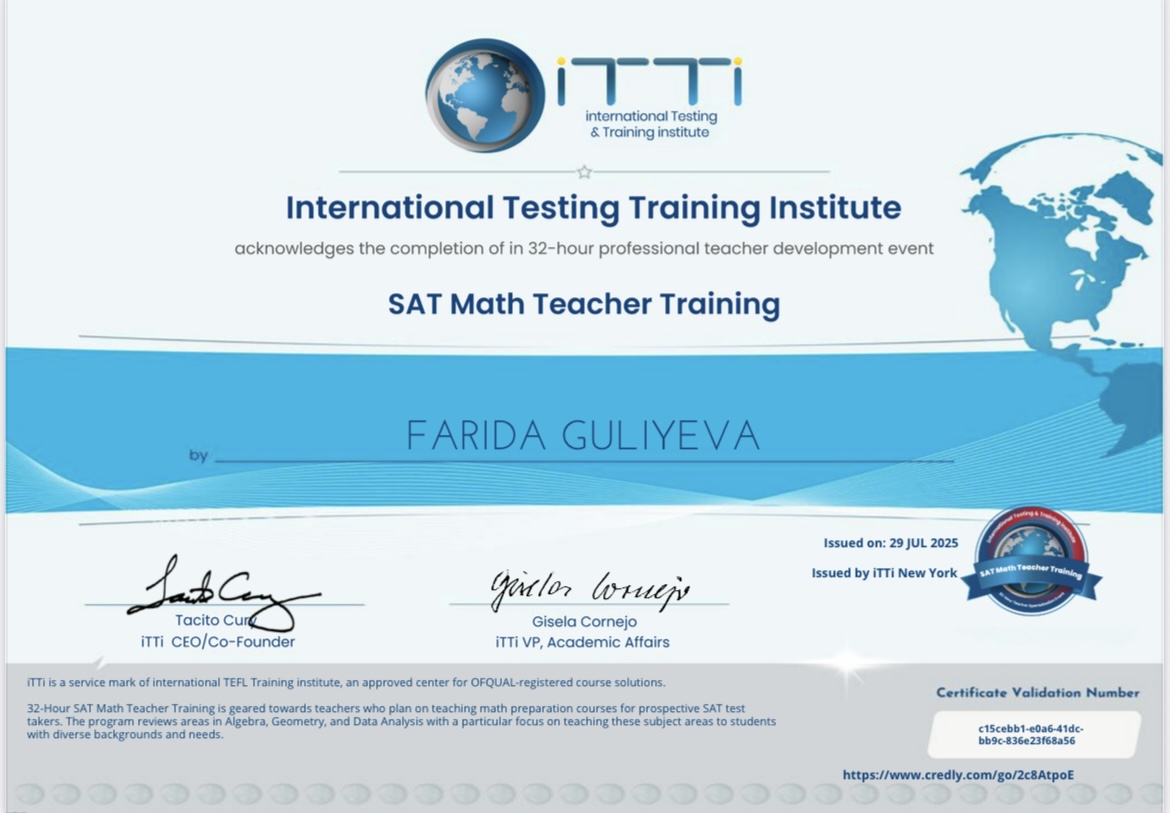 Mən Quliyeva Fəridə ,Bakı Dövlət Universitetinin Mexanika-Riyaziyyat fakültəsində təhsil almışam.Hazırda 5–8 ci siniflər təkmilləşdirmə,abituriyent hazırlığı tədris edirəm.Dərslər həm ingilis həm də Azerbaycan sektorları üçündür.Yüksək nəticə əldə etmək üçün müraciət edə bilərsiz.
