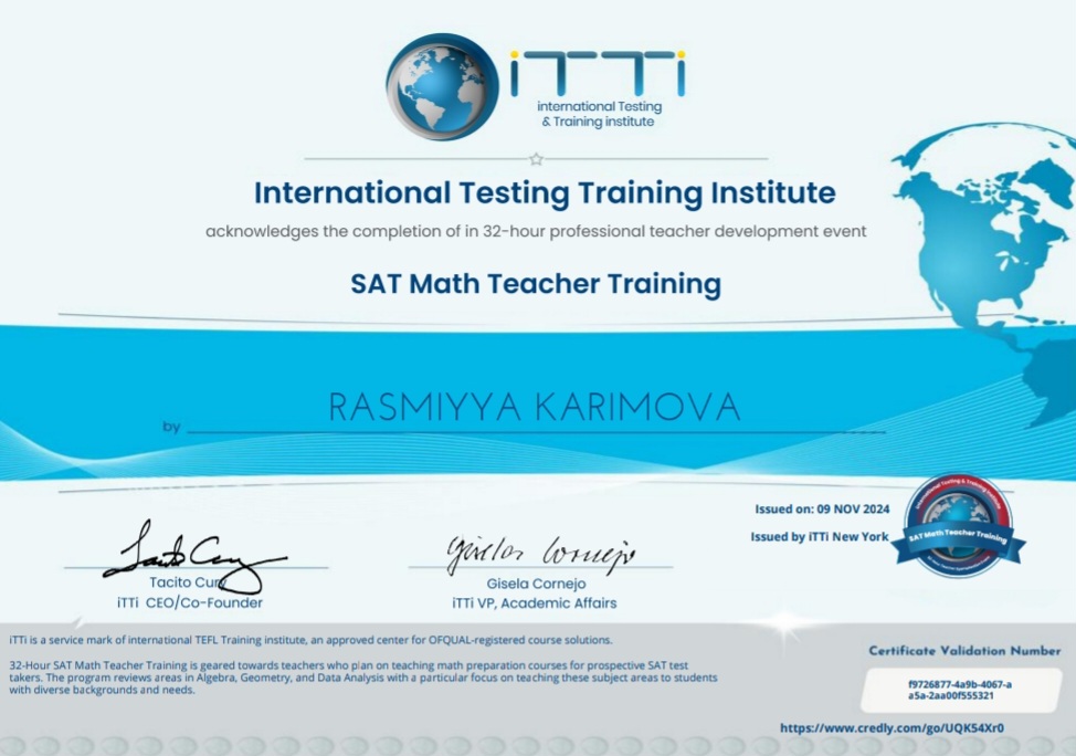 Mən Rəsmiyyə Kərimova.Bakı şəhər Qaradağ rayonun 228saylı orta məktəbini bitirmişəm,ali məktəb SDU-nun riyaziyyatçı və riyaziyyat müəllimliyi ixtisası üzrə təhsil almışam.2012-ci ildən repetitorluq ilə məşğulam.2019-cu ildən DİM-in marker müəllimiyəm.OHİM kursunun rəhbəriyəm.