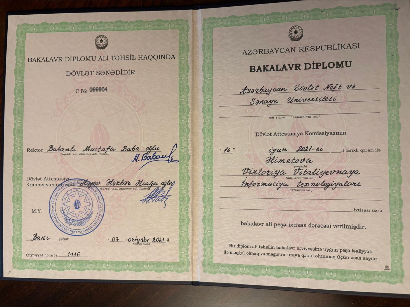Azerbaijan Dövlet Neft və Sənaye Universiteti Bakalavr diplomu
