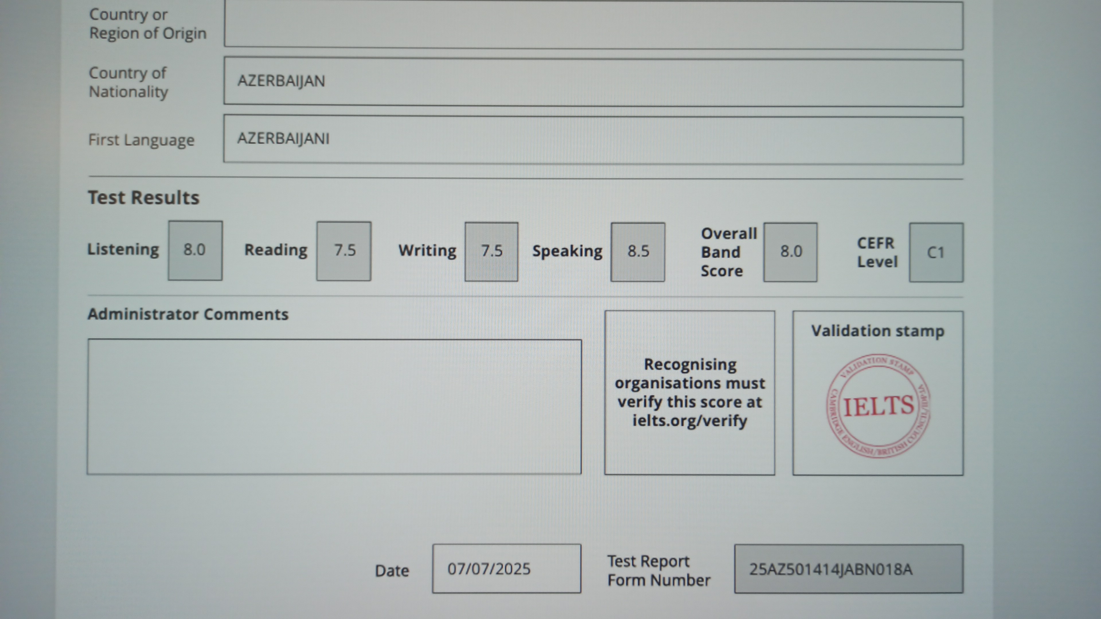 I had a limited amount of time to prepare for the IELTS, and Nigar khanim made every lesson count. Her teaching style is clear, structured and full of practical tips that you can immediately apply. Even in a short period, I saw significant improvement in my skills, and thanks to her guidance, I was able to achieve a 7.5 on my exam. I really appreciate her personalized and supportive approach, and I would highly recommend her to anyone looking to prepare efficiently for IELTS.