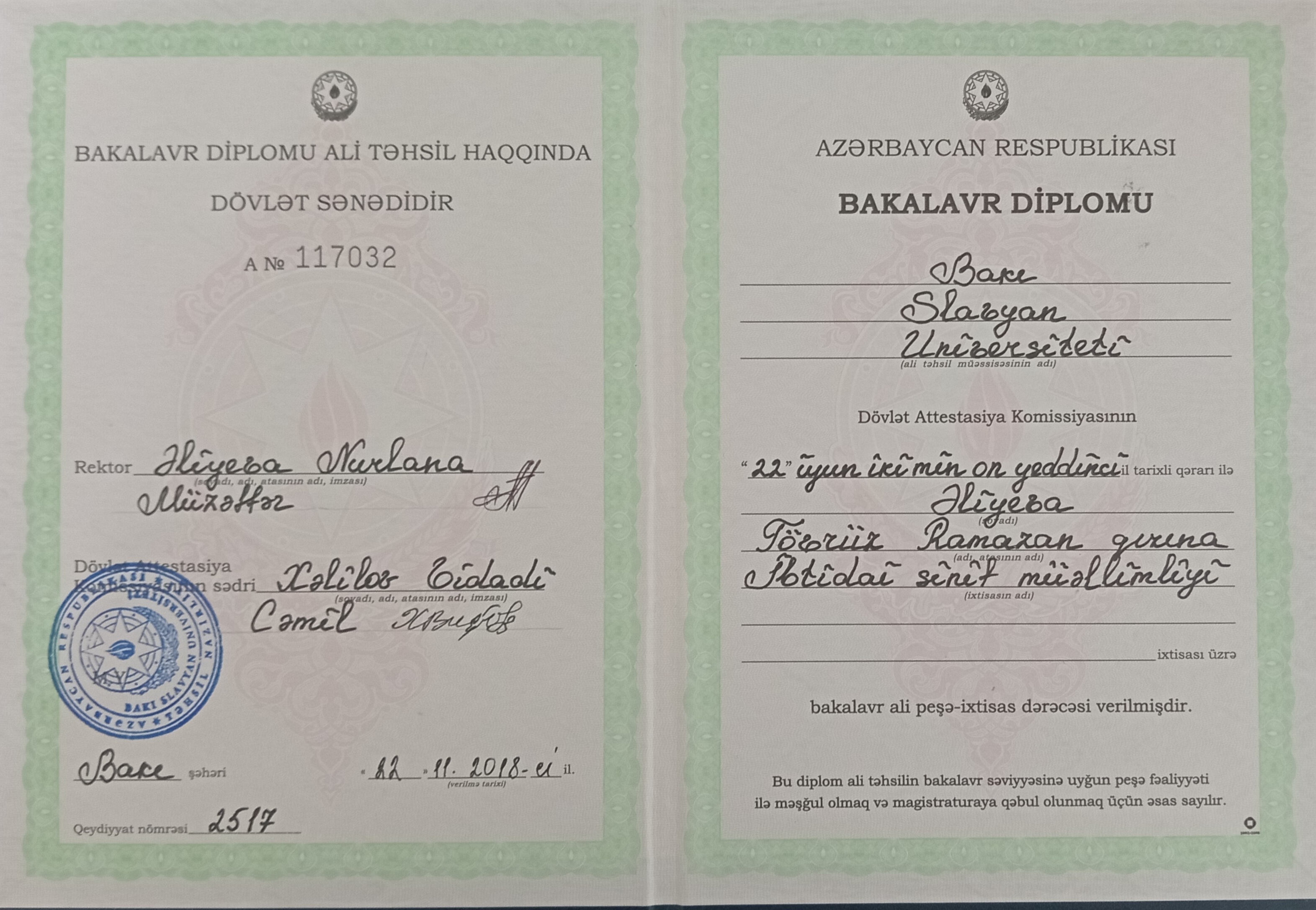 Bakalavr təhsilim Rus dili və ədəbiyyatı ixtisası üzrədir. 23 il ərzində həm rus dili və ədəbiyyatı tədrisi ilə həmdə ki, ibtidai siniflərdə tədrisin təşkili ilə məşğul olmuşam və kifayət qədər təcrübəm var. Bu dövr ərzində peşəkarlıq səviyyəmi yüksəltməkdən ötrü müxtəlif proqramlarda və layihələrdə iştirak etmişəm. Məktəbəqədər təhsil müəsiss