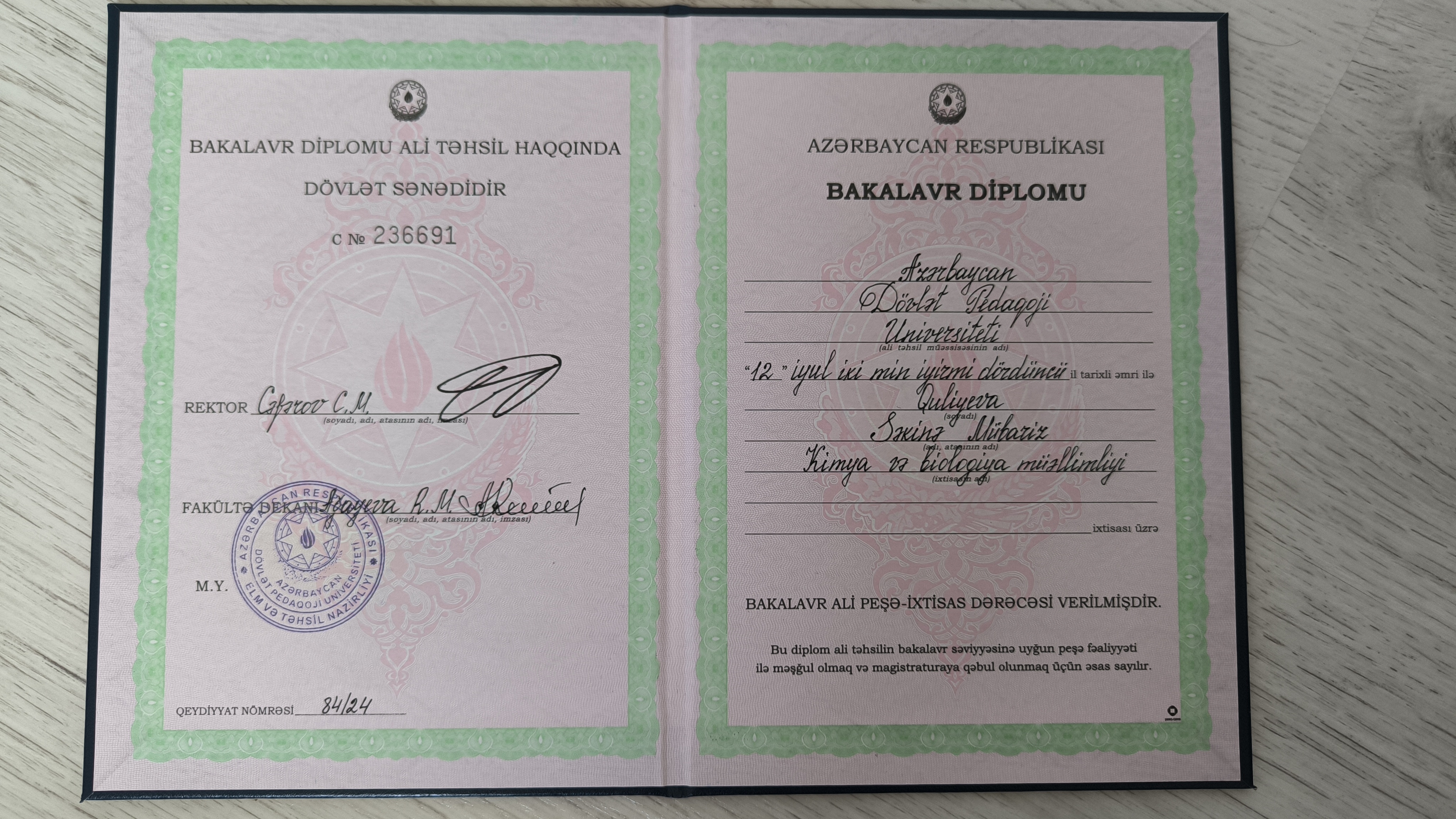 ADPU kimya və biologiya fakultəsi 2013-cü il məzunuyam. 2014-cü ildə ucqar kənddə fəaliyyətə başlamışam,2021-ci ildən 53 nömrəli məktəbin kimya müəllimi kimi işləyirəm. İnstagramda kimya_muellimi_billure adını klikləyərək nəticələrlə tanış ola bilərsiniz. 100dəfə deməkdənsə, 1dəfə görsəniz məsləhətlidir. Məzunlarımla qürur duyuram,çünki onlar say