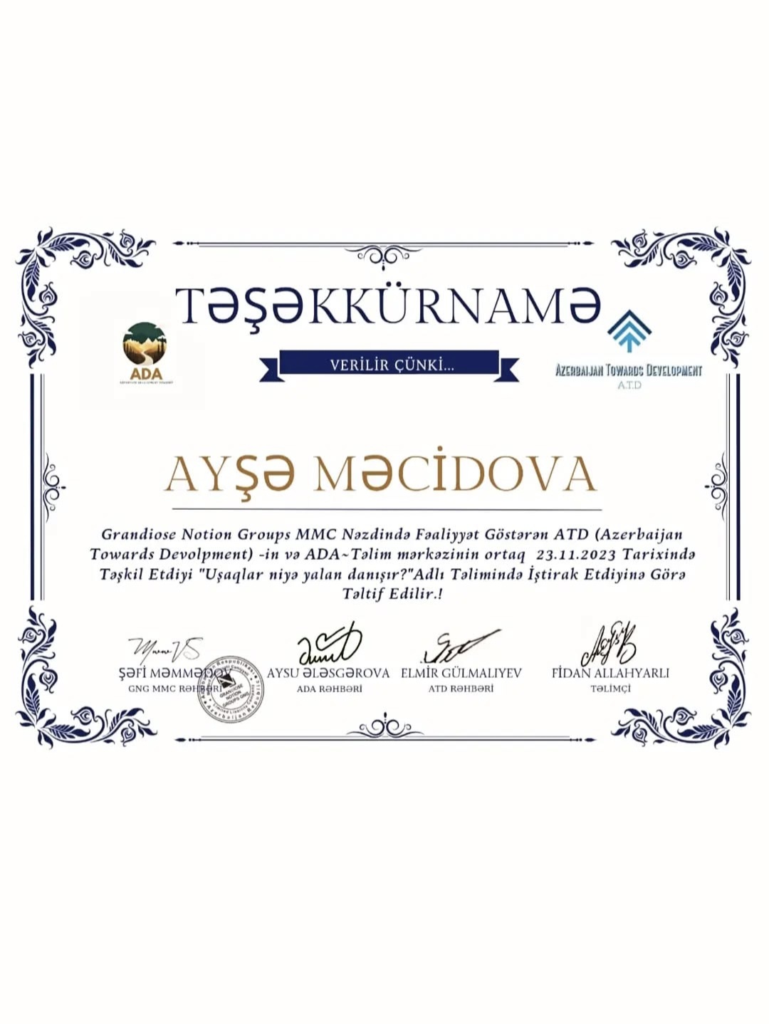 ADA qalaktika cəmiyyəti və Azərbaycan Texnologiya universiteti Elmi Cəmiyyəti tərəfindən xasiyyətnamə