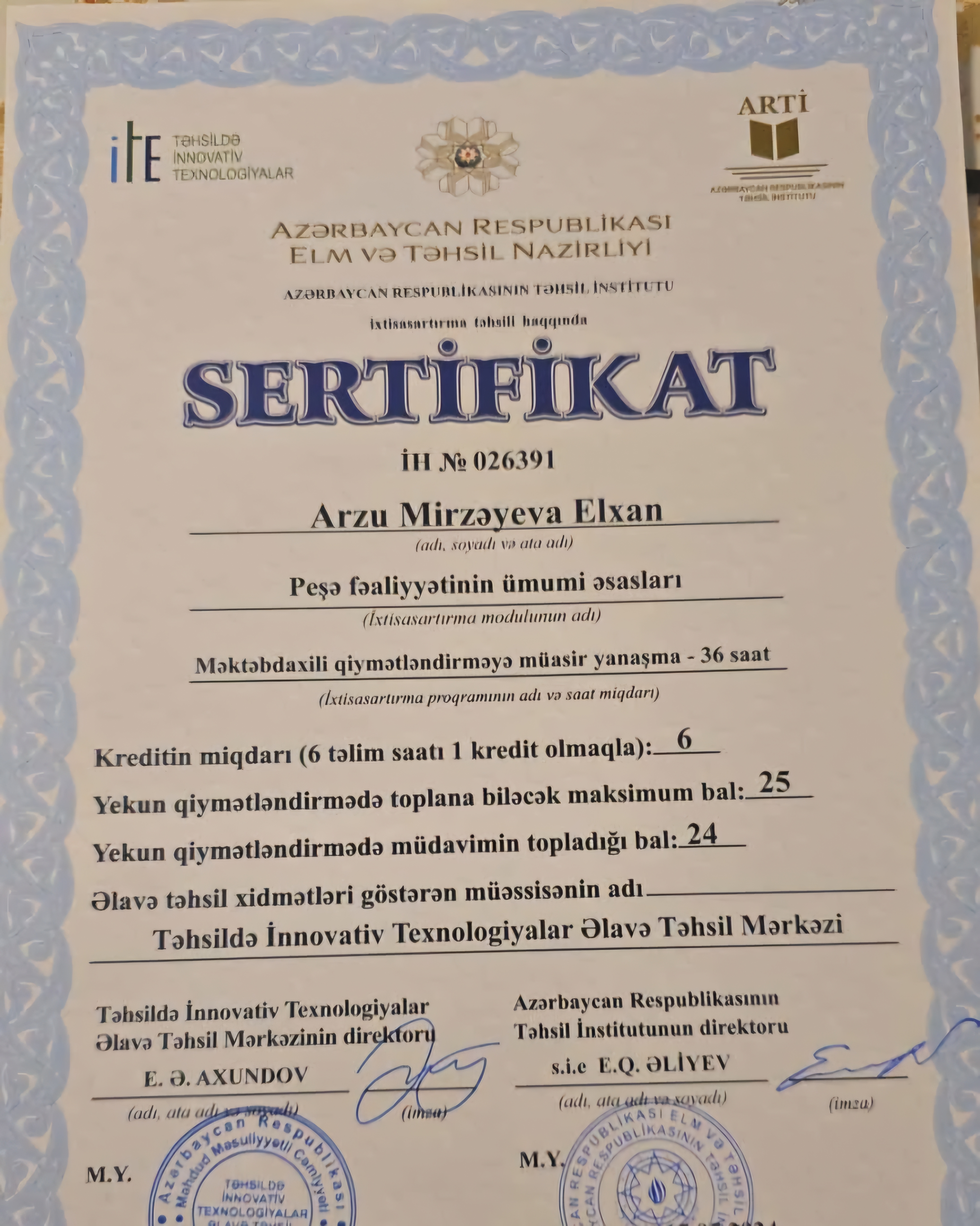 Təhsil İnstitunun ixtisasartırma kursu haqqında sertifikat