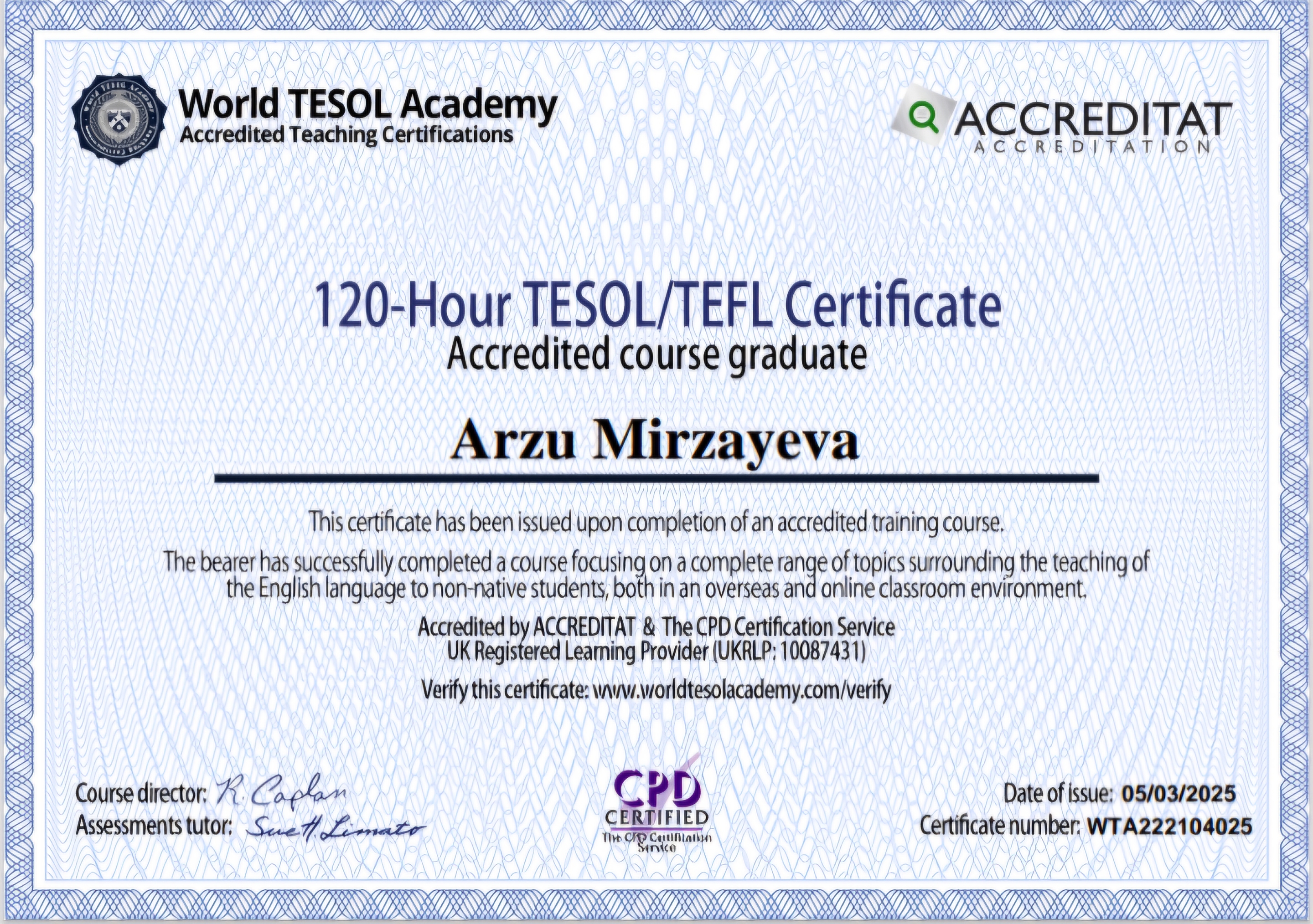 World Tesol Academy tərəfindən verilən TESOL/TEFL sertifikatı
