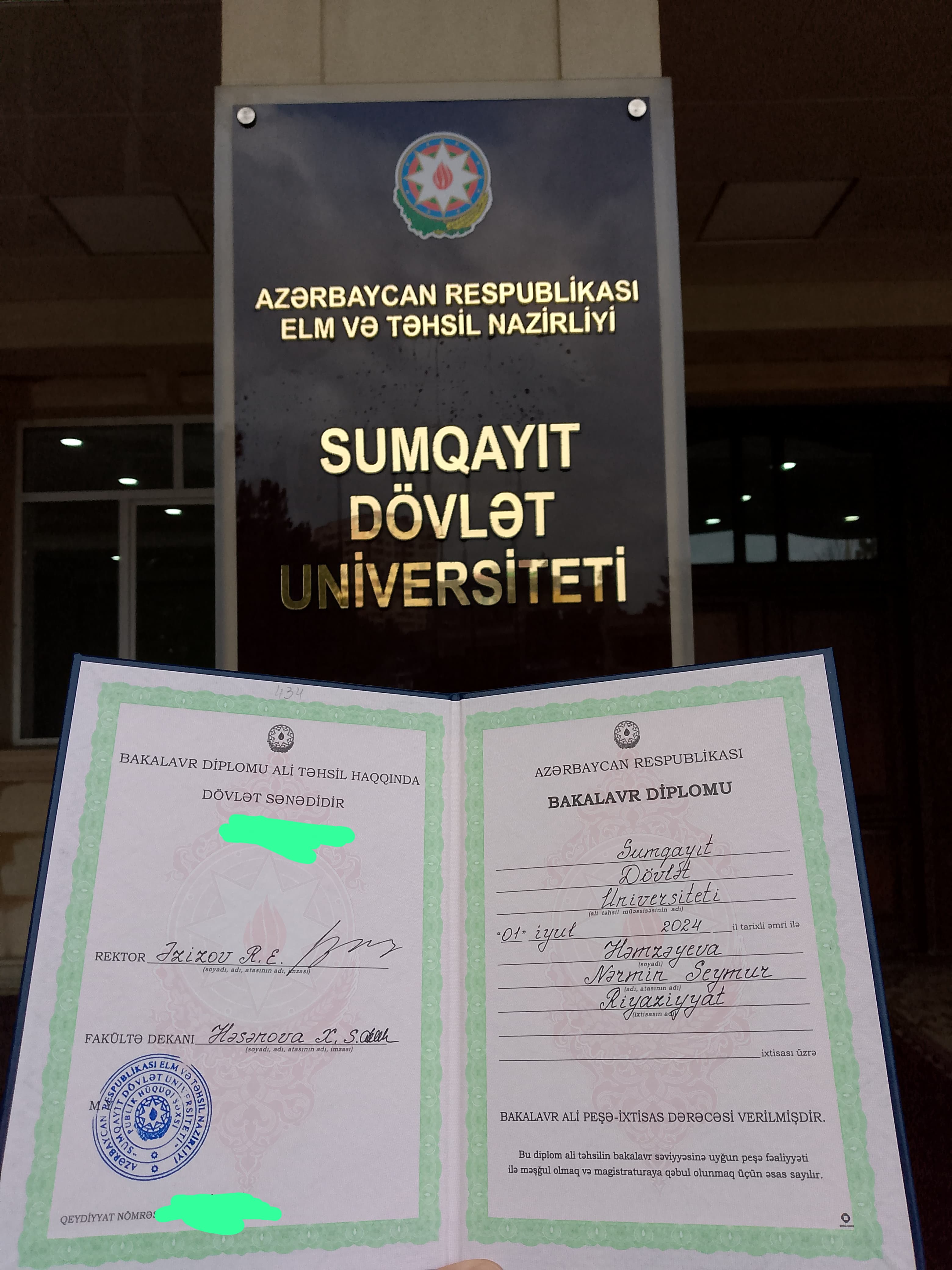 Mən, Nərmin Quliyeva, 2024-cü ildə Sumqayıt Dövlət Universitetinin Riyaziyyat fakültəsini bitirmişəm.