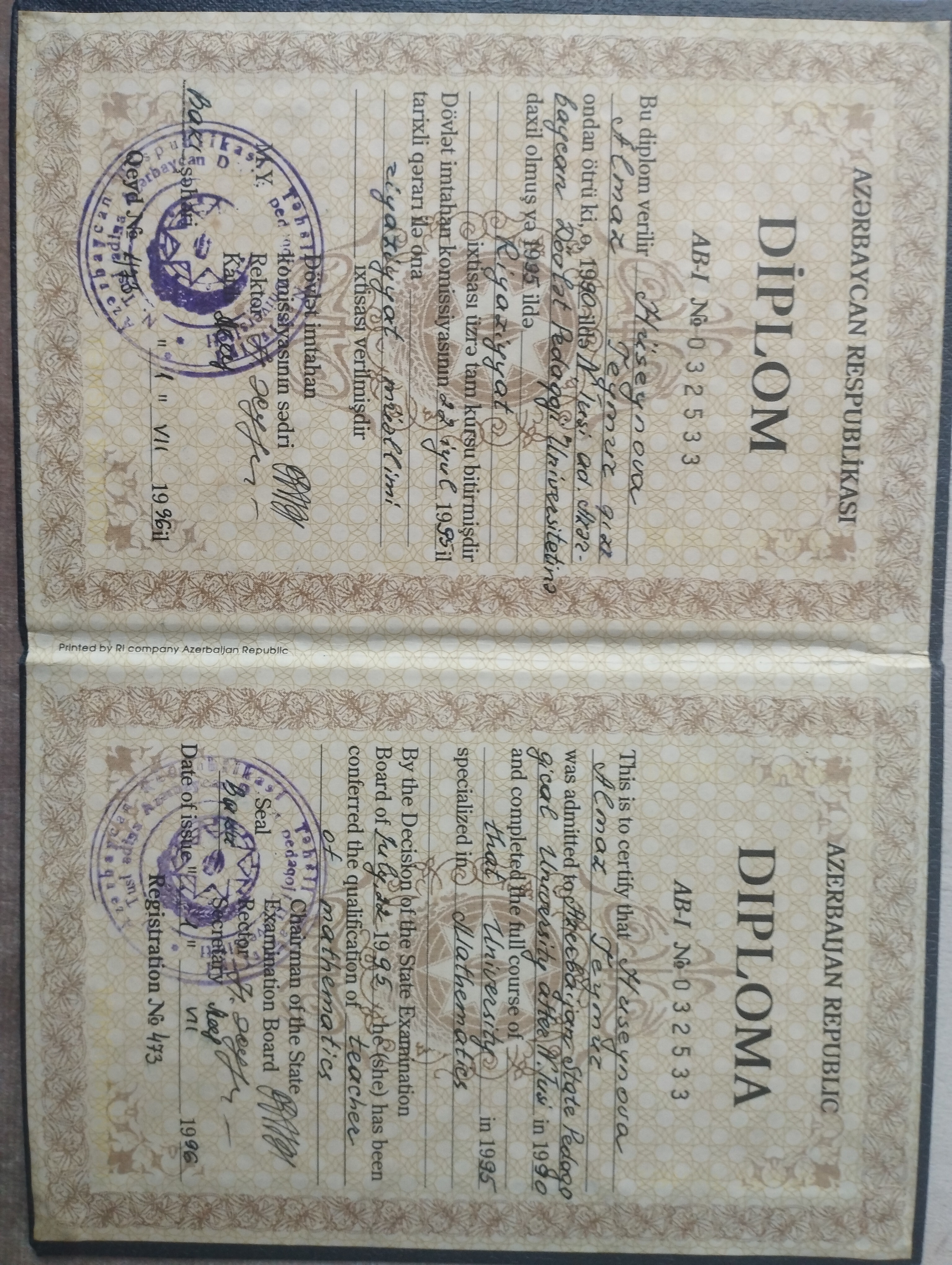 Hüseynova Almaz Bakalavr təhsilimi Azərbaycan Dövlət Pedaqoji Universitetində Riyaziyyat müəllimi üzrə almışam.2000-ci ildən Bərdə şəhər Tofiq İsmayılov adına 1 saylı tam orta məktəbdə fəaliyyətə başlamışam .Hal-hazırda fəaliyyətimi həmin məktəbdə davam etdirirəm .Repetitorluq edirəm. Dərslər əyani və online formada həftədə 3 dəfə 90 dq olmaqla keçirəm