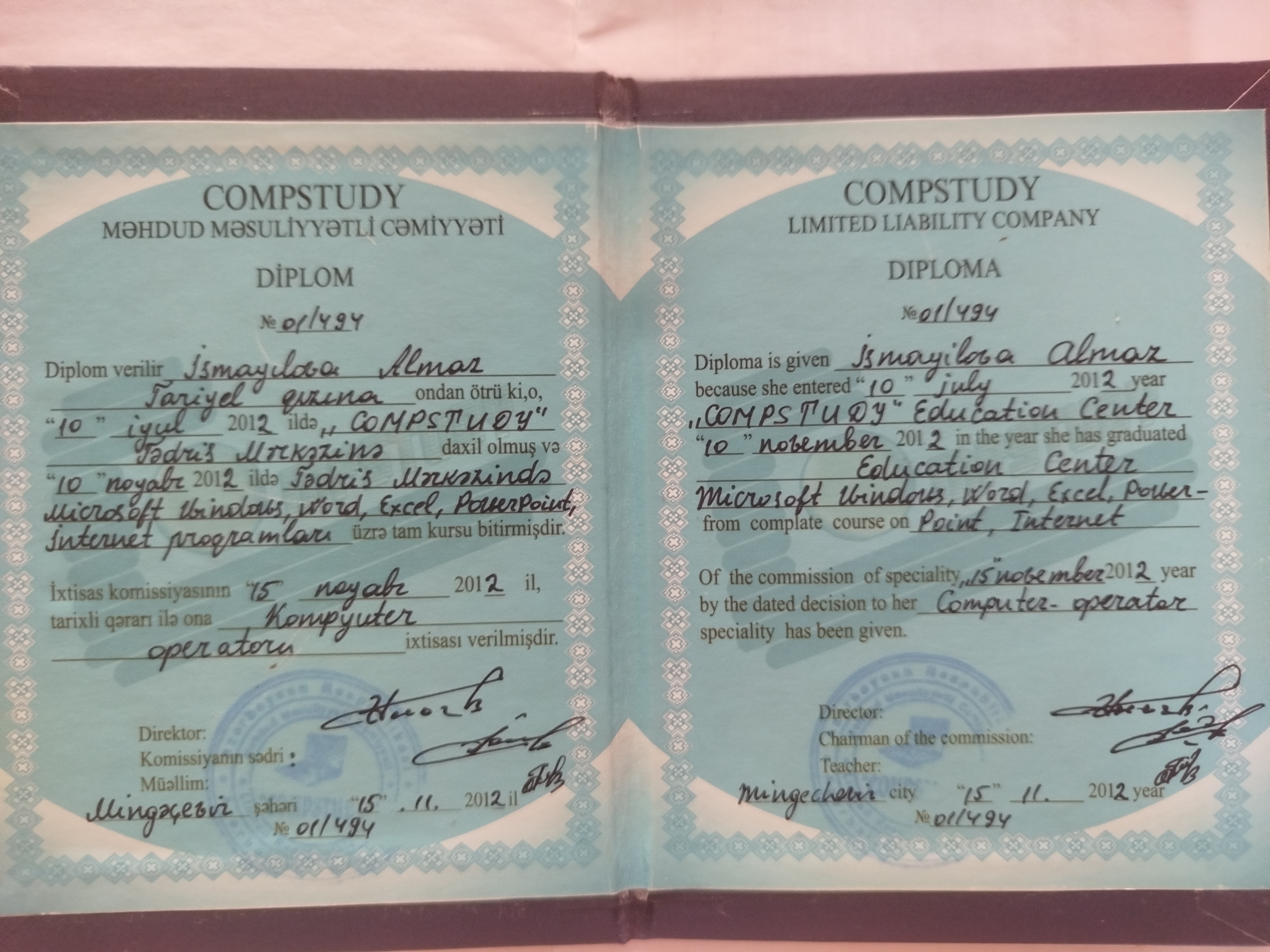Compstudy tədris mərkəzinin kompyuter operatorluğu diplomu