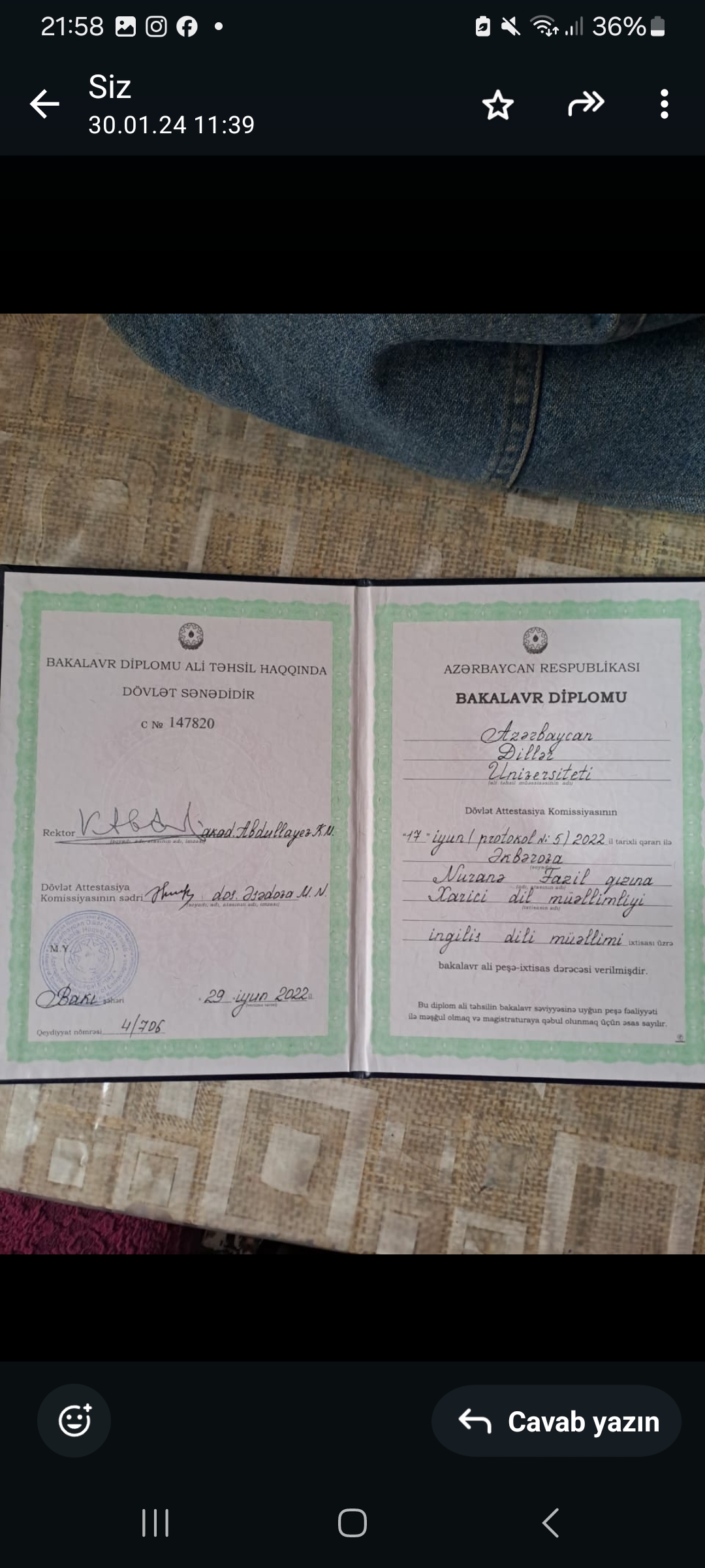 Mən Hacıyeva Nuranə. Azərbaycan Dillər Universitetini bitirmişəm. 2025ci ildə miq imtahanında 89.7 bal toplamışam. 5 illik pedaqoji təcrübəm var. Magistr, abituriyent və təkmilləşdirmə üzrə ingilis dilini tədris edirəm. Dərslər həm fərdi, həm də qrup şəklində olur. Qısa zaman ərzində uşaqlara ingilis dilini sevdirərək yüksək nəticələr əldə edirik. İlk dərs sınaq dərs olacaq.