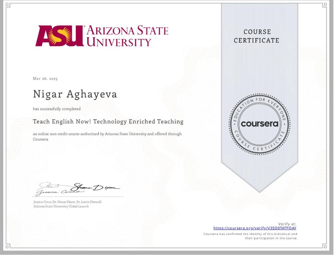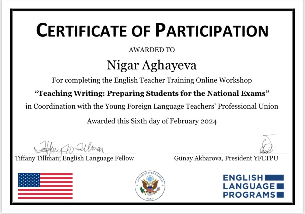 Azərbaycan Dillər Universitetində bakalavr və magistr pillələrində "İngilis dili müəllimi", "Dilşünaslıq" ixtisasları üzrə təhsil almışam. Bir sıra tədris mərkəzində fəaliyyət göstərmişəm. Arizona Dövlət Universitetindən TESOL beynəlxalq sertifikatını, həmçinin London universitetinin sertifikatını əldə etmişəm. Yerli ali məktəblərin birində ingilis dili müəllimi vəzifəsində çalışıram.