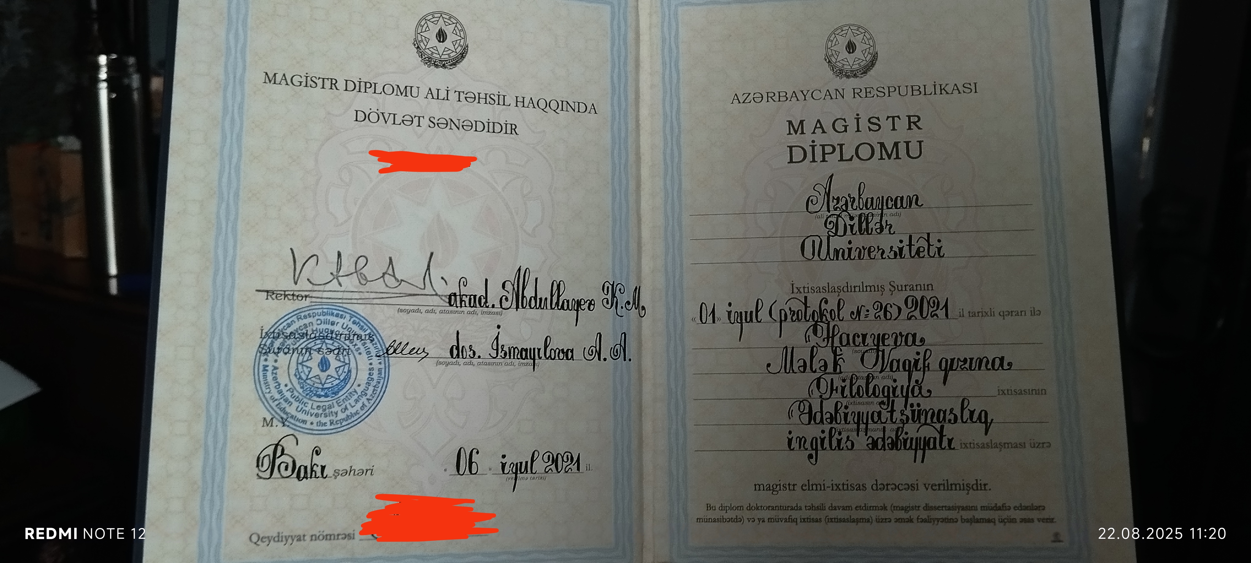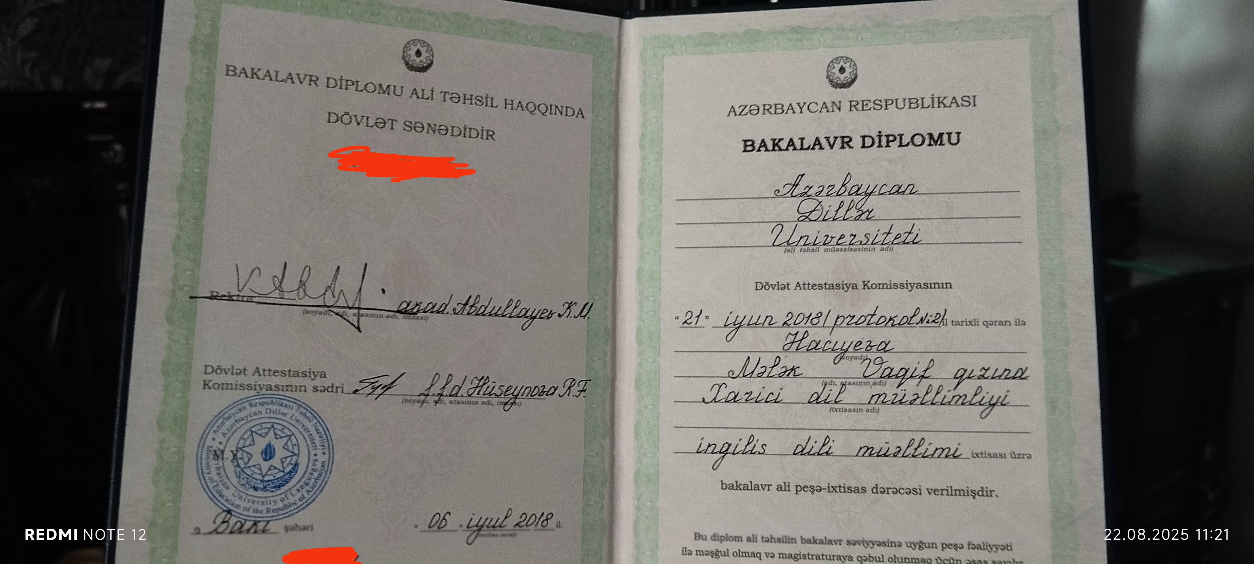Bakalavr və magistr dərəcələrini Azərbaycan Dillər Universitetində almışam. Tam orta məktəbi Moskva şəhərində Qızıl medalla bitirmişəm. Moskvanın ən yaxşı məzunları 2011 kitabında yer almışam. 2011ci ilin ən yaxşı şagirdi nominasiyası qalibiyəm. Fərqli fənlər üzrə Olimpiyada iştirakçısı və qalibi olmuşam. Rus, azərbaycan bölmələri üçün ingilis dilini tədris edirəm. Həm abituriyentlər, həm şagirdlər, həm böyüklər müraciət edə bilər.