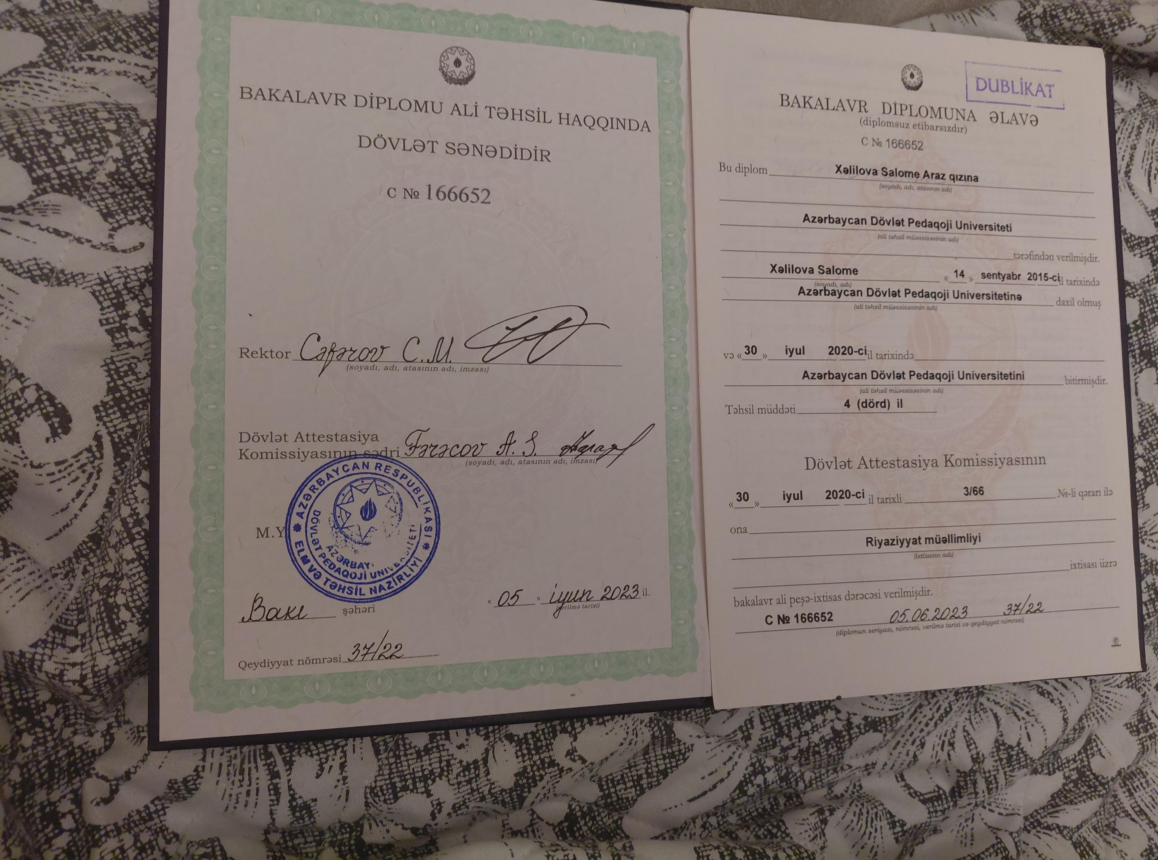 Mən Xəlilova Səlimə Azərbaycan dövlət Pedaqoji Universitetinin riyaziyyat informatika fenninin riyaziyyat müəlliməliyini bitirmişəm.