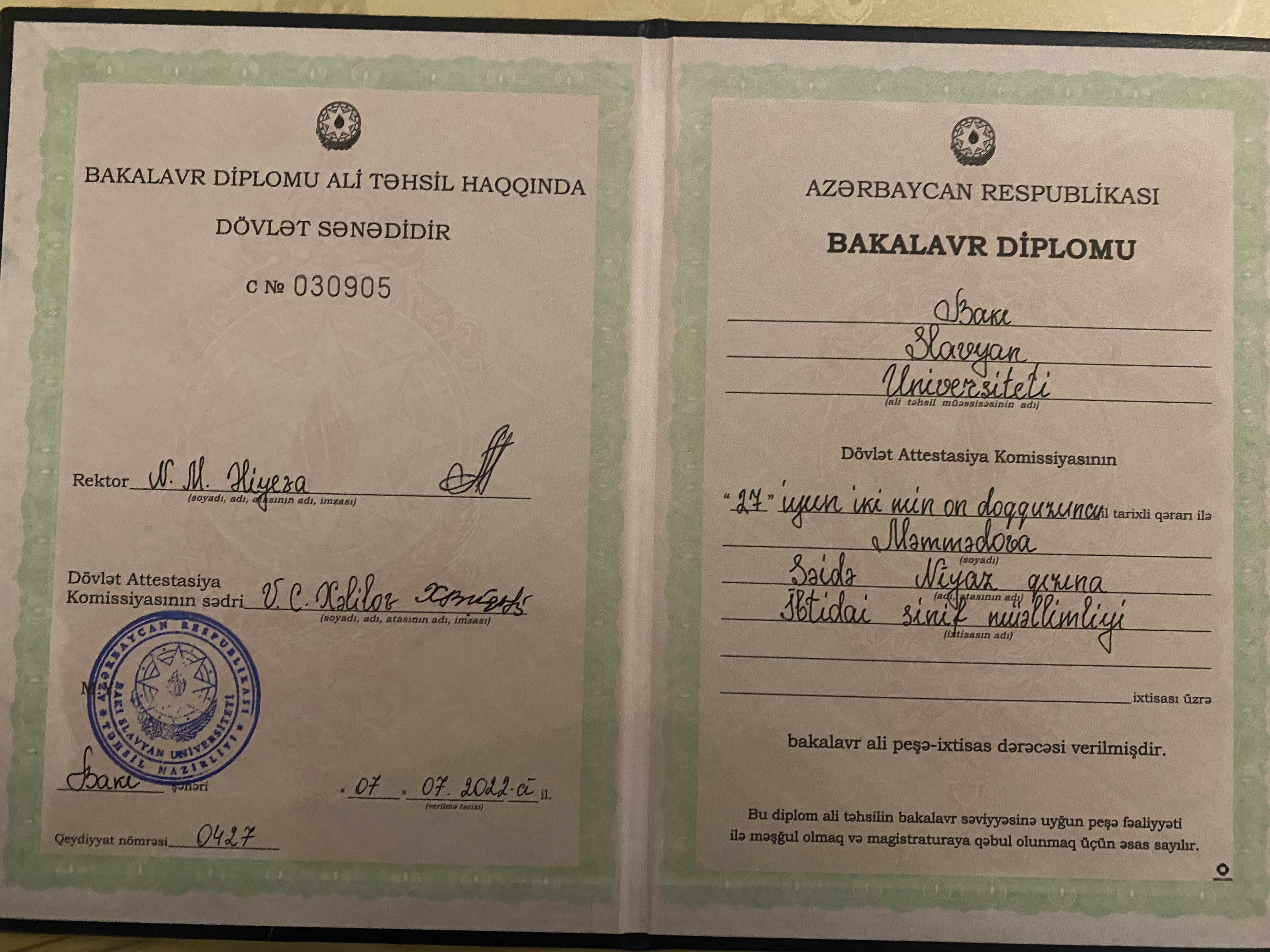 Я, Мамедова Саида Ниязовна, закончила Бакинский Славянский Университет, защитив диплом на «отлично» . Набрав в Миг 56 баллов из 60, начала работать в 39-ой школе им. М. Джалал Пашаева в г. Гяндже. 10 лет работаю с детьми. Знаю систему куррикулума. Хорошо лажу с детьми и применяю индивидуальный подход к каждому ребенку.