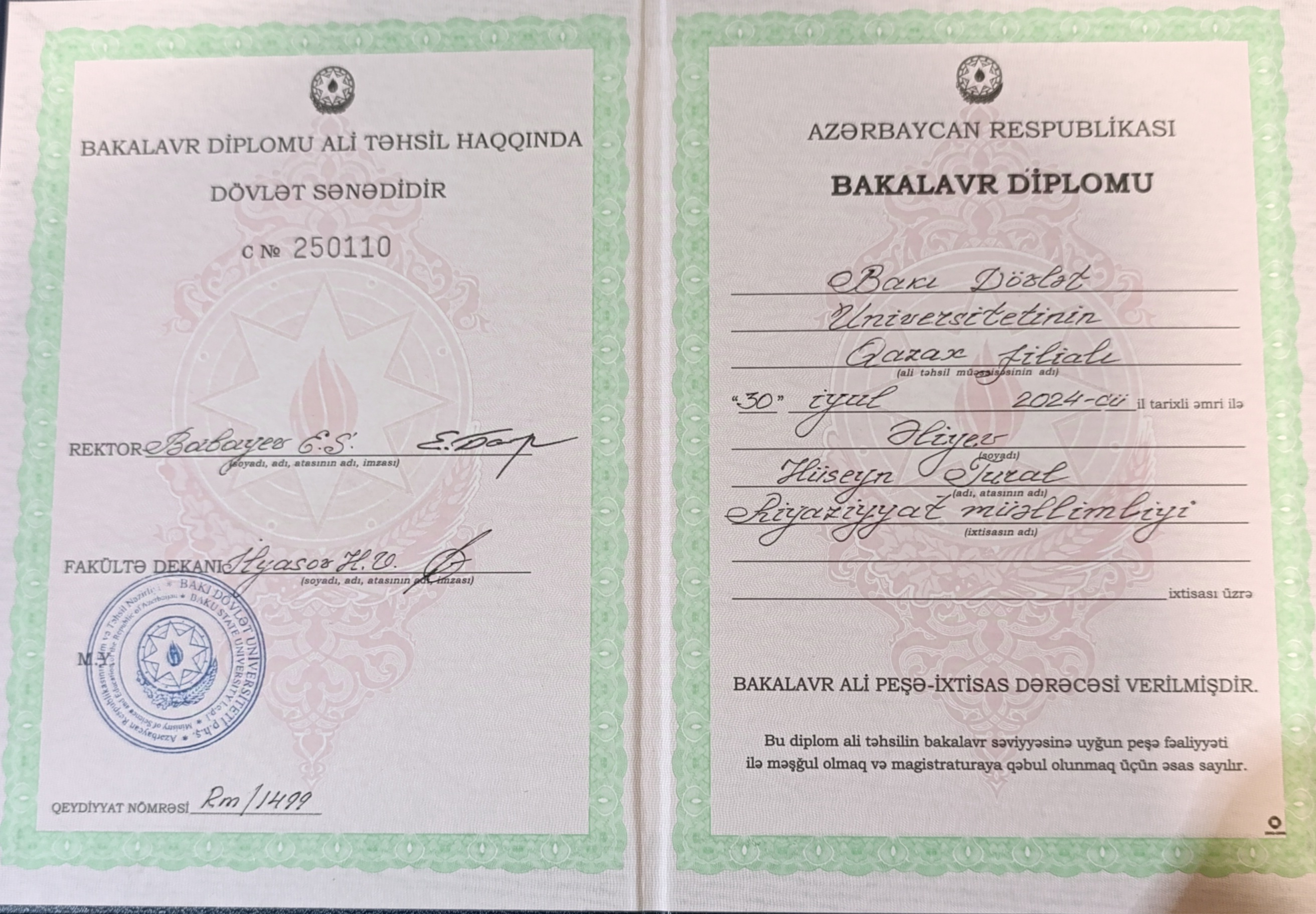 Azərbaycan Dövlət pedaqoji Universitetinin Riyaziyyat və İnformatika ixtisası üzrə təhsil almışam. Hal-hazırda Riyaziyyat hazırlığı ilə məşğulam. (Az sektor) Təkmilləşdirmə və Abituriyentlərə Online, ənənəvi Qrup və fərdi şəkildə hər tərəfli proqramı mənimsədirəm. Qrup şəklində 1 nəfər 60 AZN , fərdi isə sinifə görə dəyişir. Əlavə məlumat üçün əla