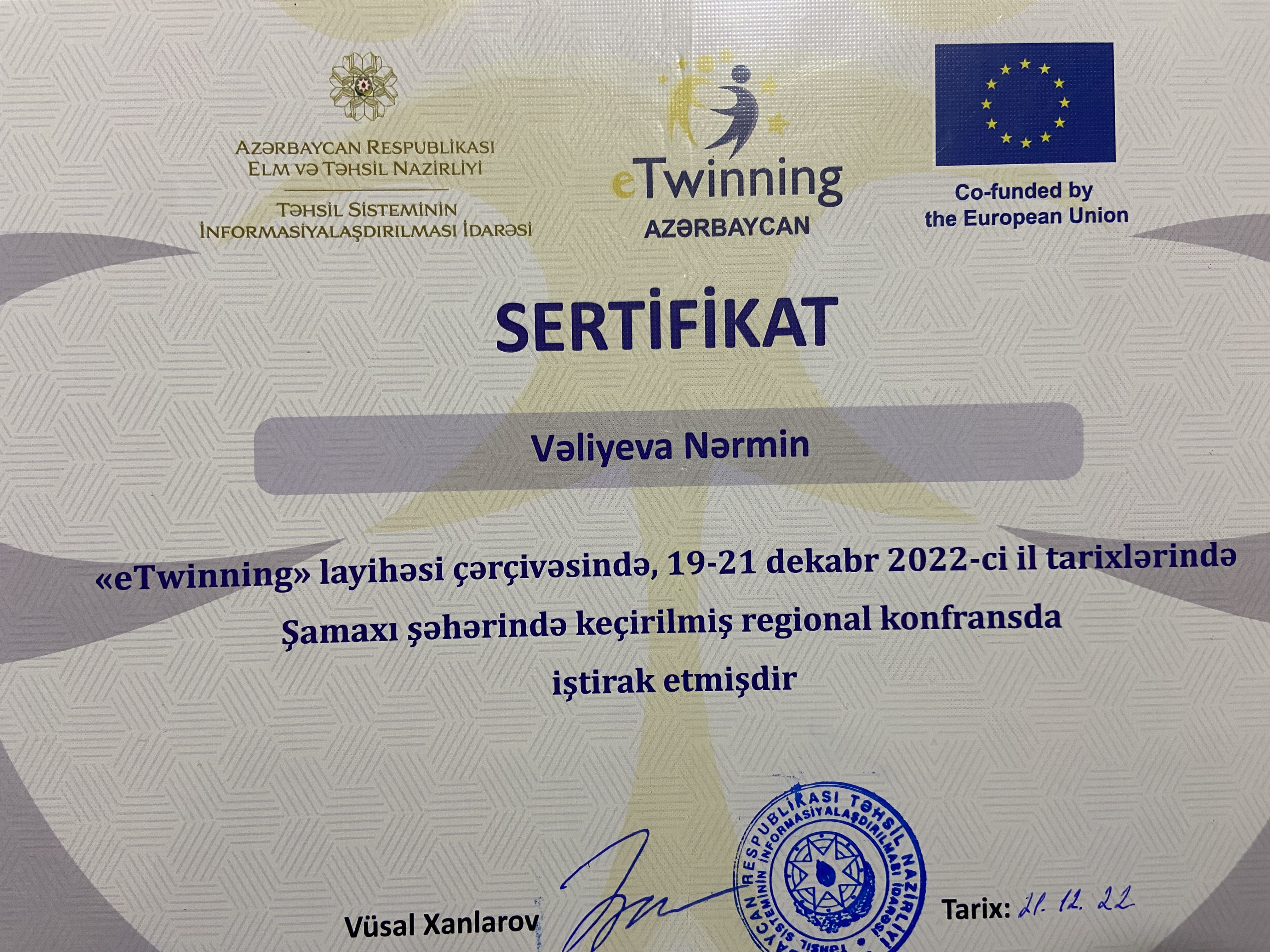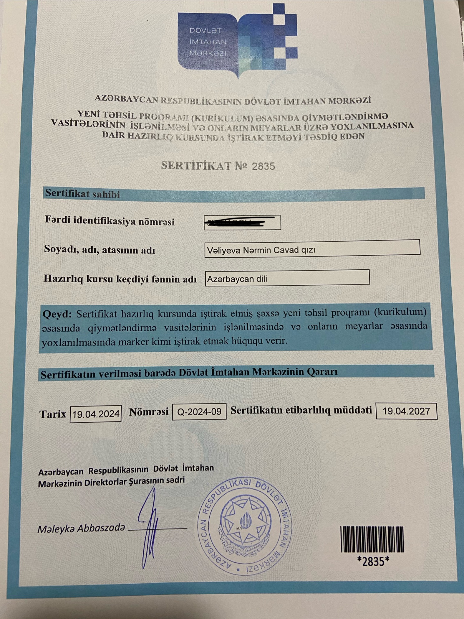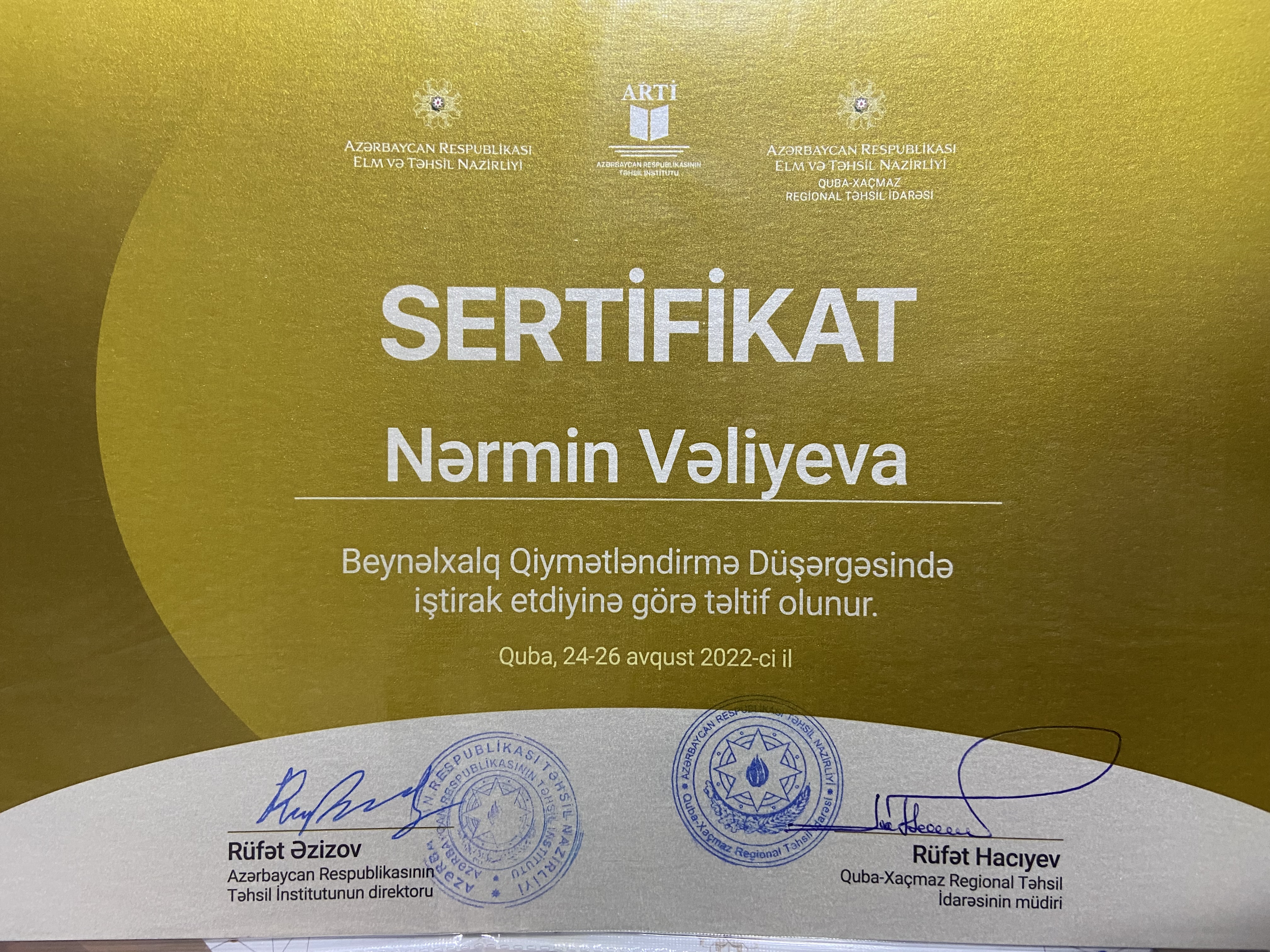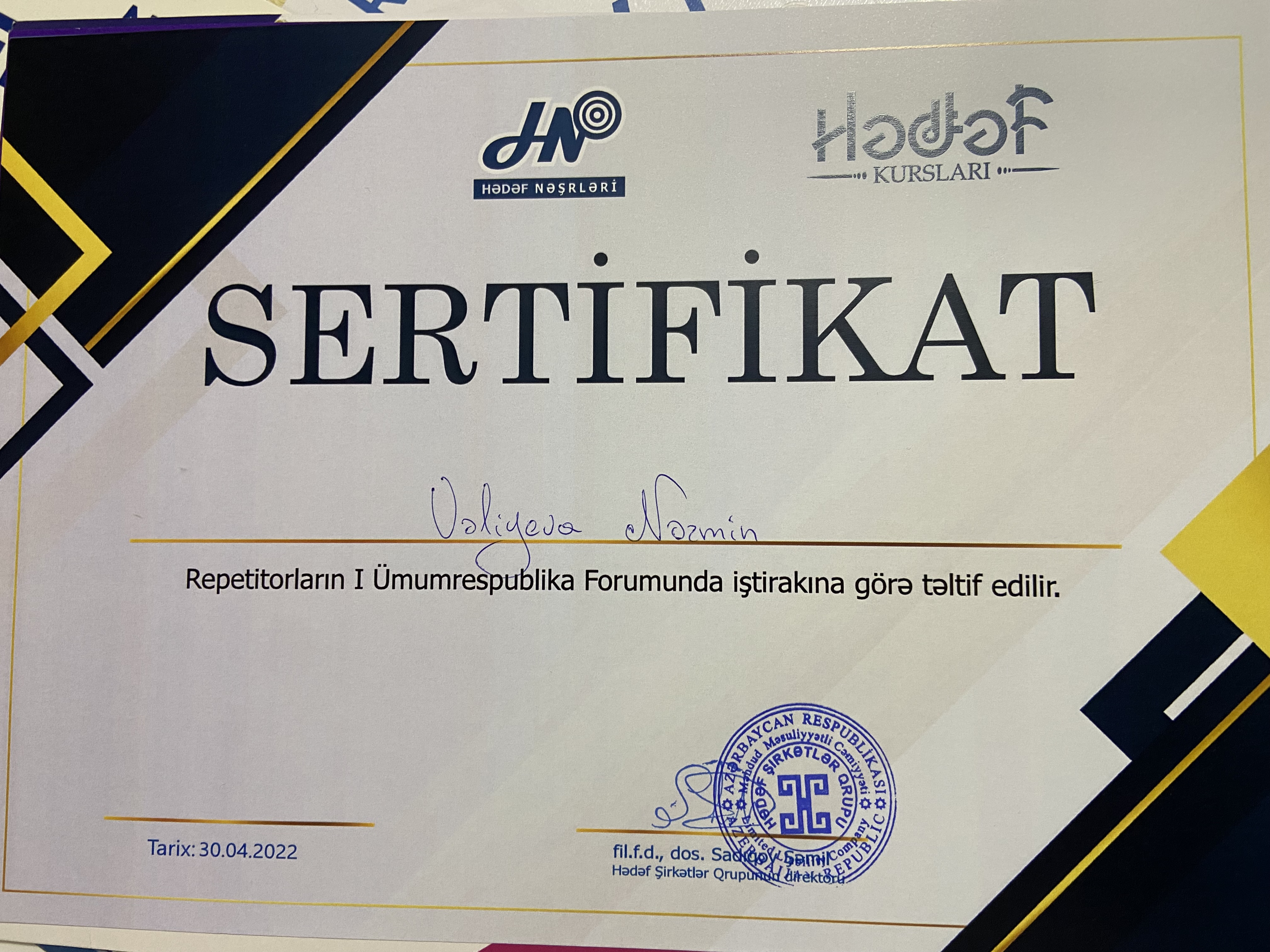 Müəllimlərin sertifikatlaşdırma imtahanında 55 bal toplayaraq uğurla keçmişəm. Bundan əlavə, Dövlət İmtahan Mərkəzində marker müəllim kimi fəaliyyət göstərirəm. Bu, mənim həm imtahan tələblərini, həm də qiymətləndirmə meyarlarını dərindən bilməyimə şərait yaradır.