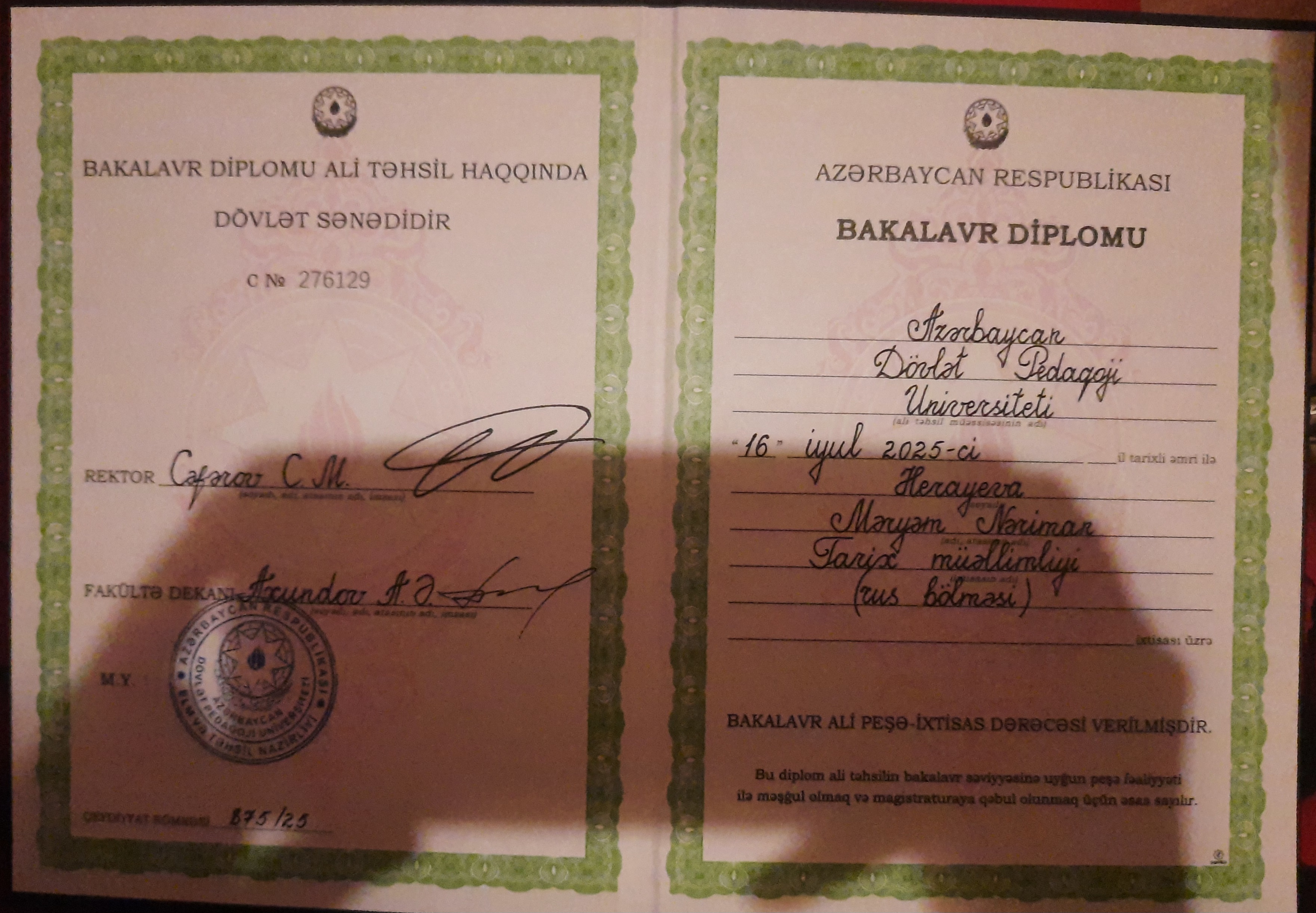 Mən Herayeva Məryəm Nəriman qızı, 2002-ci ildə anadan olmuşam. 2021-ci ildə Azərbaycan Dövlət Pedaqoji Universitetinə daxil olmuş və 2025-ci ildə yüksək göstəricilərlə məzun olmuşam. Təhsil müddətində uşaqlarla fərdi və qrup məşğələləri keçmiş, onlarla işləməkdə təcrübə qazanmışam.