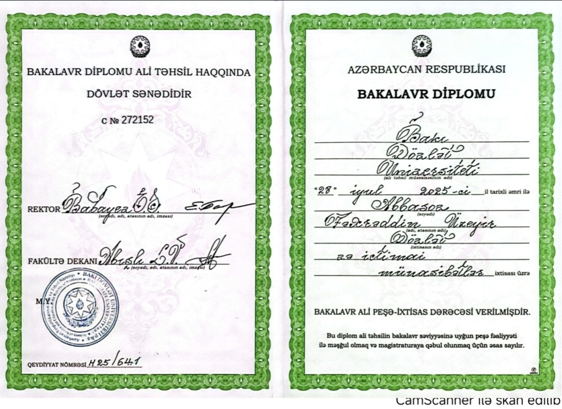 571.4 balla 2021 ci ildə Bakı Dövlət Universitetinin Dövlət və ictimai münasibətlər ixtisasına qəbul olmuşam, 2025 ci ildən Prezident yanında Dövlət İdarəçilik Akademiyasının İctimai siyasət ixtisasında təhsil alıram. Tarix fənnini tədris etmək mənim üçün hobbydir