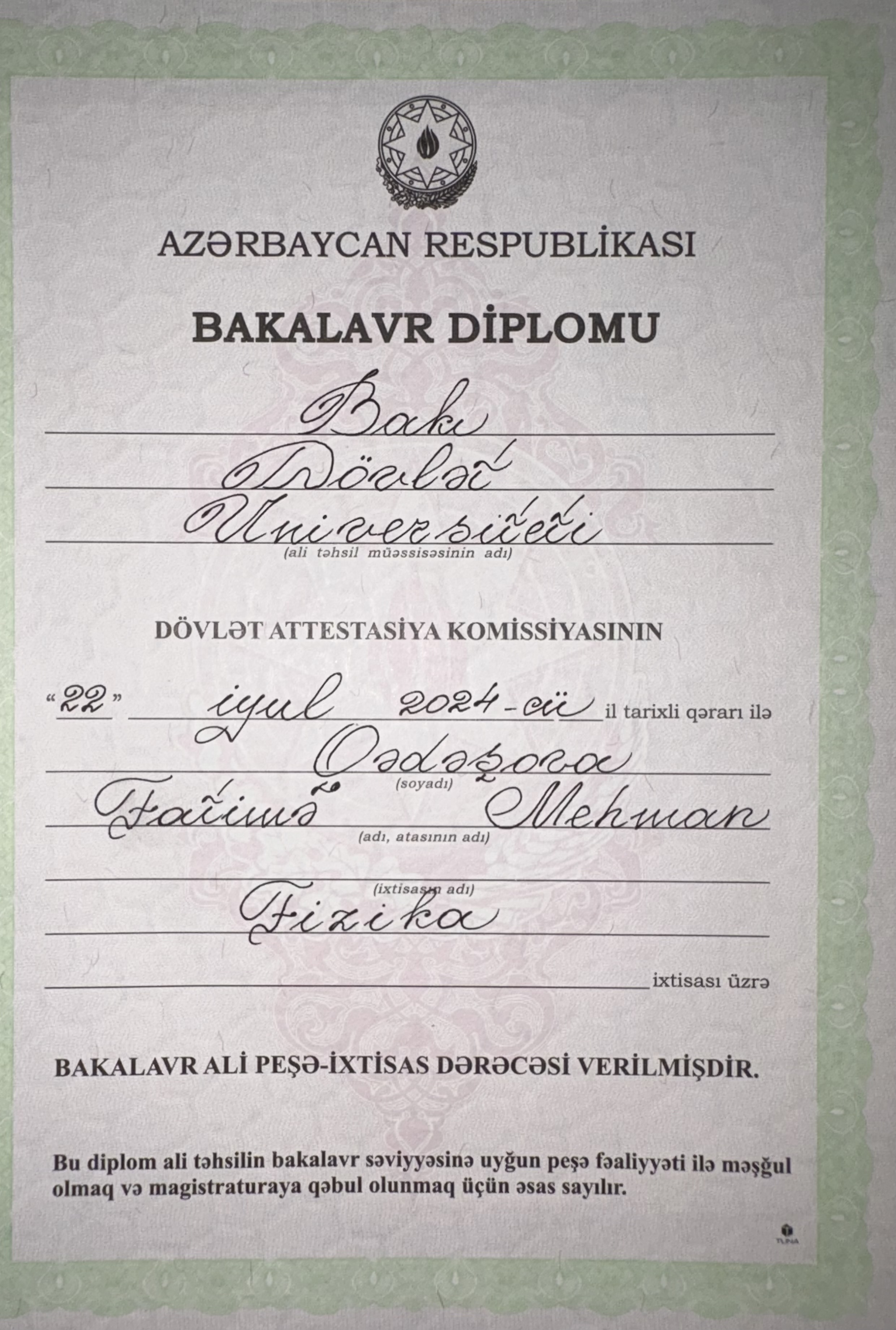 Bakalvr-Fizika müəllimlik, Magistr-ADPU-Fizikanın tədrisi metodikası bitirmişəm, 3 ildir repetitor kimi fəaliyuət göstərirəm, Gələcəyin alimləri 8-ci elmi konfransda iştirak etmişəm, əlavə 4 sertifikatım mümkündür təhsil üzrə, RFM, RFO yer tutan şagirdlərim var