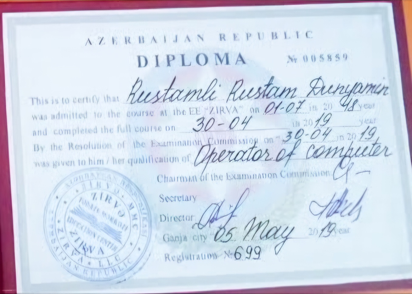 Mən Rüstəm Rüstəmli GDU-nin Sosial iş ixtisası üzrə təhsil almışam. Zirvə tədris mərkəzində 1 illik komputer operatoru kursunu bitirmişəm. Bundan əlavə Muhasibat uçotu, SMM və 1C 8.3 təlimlərini uğurla başa vurmuşam. Bir neçə fərdi sahibkara Excel proqramı üzərindən anbar uçotu, kadr uçotu və maliyyə uçotunu özündə birləşdirən Excel file ni uğurla təhvil vermişəm. 2022 ci ildən ofis proqramları təlimçisi olaraq fəaliyyətə başlamışam.
