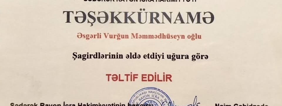 Şagirdlərimin yüksək nəticəsinə görə İcra Hakimi tərəfindən təşəkkürnamə
