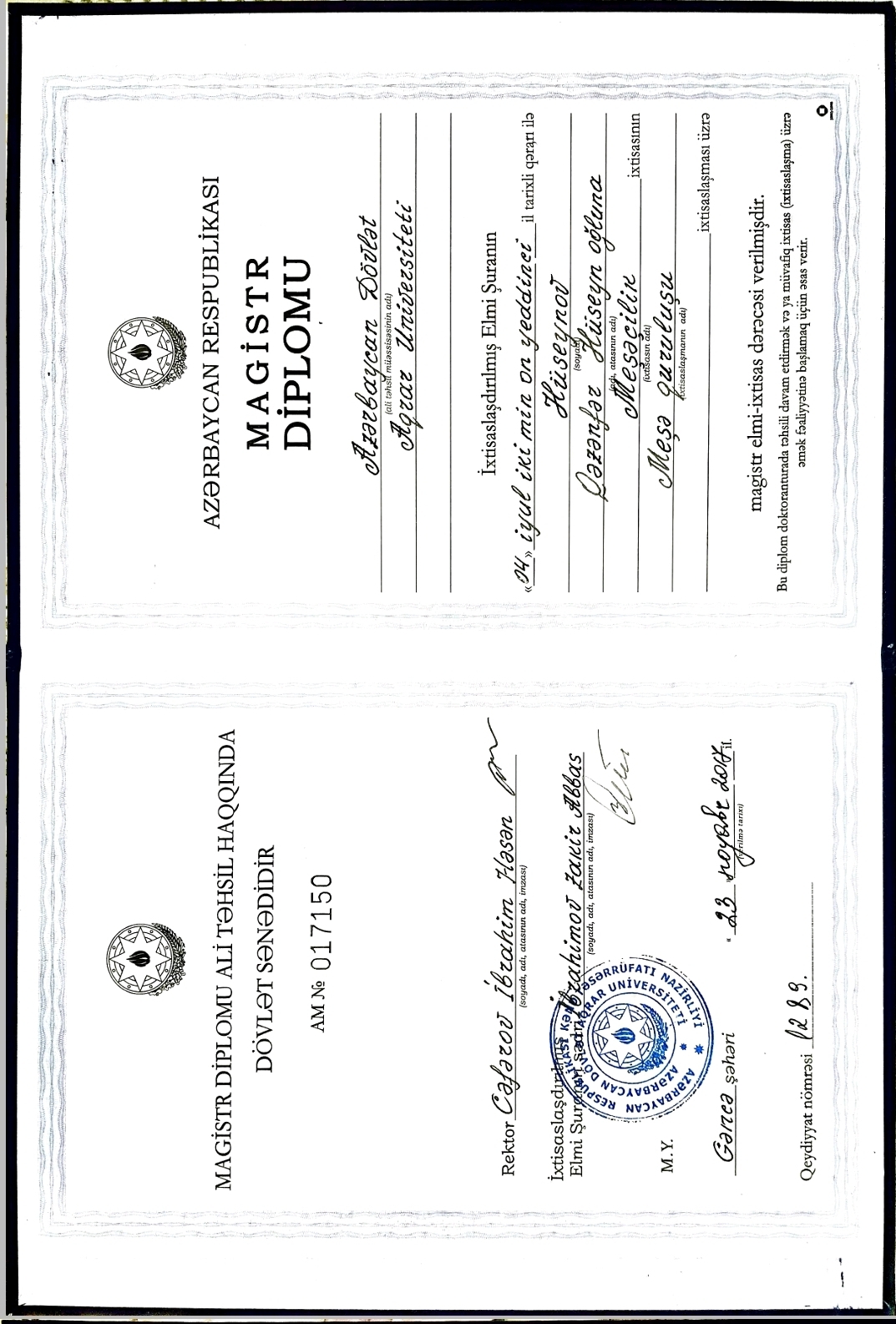 Я имею честь рекомендовать Газанфара Гусейнова как высокопрофессионального и увлечённого своим делом учителя химии. В процессе своей педагогической деятельности он демонстрирует глубокие знания предмета, умение понятно и увлекательно доносить сложный материал до учеников, а также вдохновлять их на изучение науки. Газанфар Гусейнов отличается высоким уровнем ответственности, терпением и вниманием к каждому ученику. Благодаря его усилиям многие обучающиеся успешно осваивают химию, участвуют в конкурсах и олимпиадах, а также продолжают развиваться в научной сфере. Уверен, что профессионализм, доброжелательность и преданность делу делают Газанфара Гусейнова ценным педагогом и наставником.