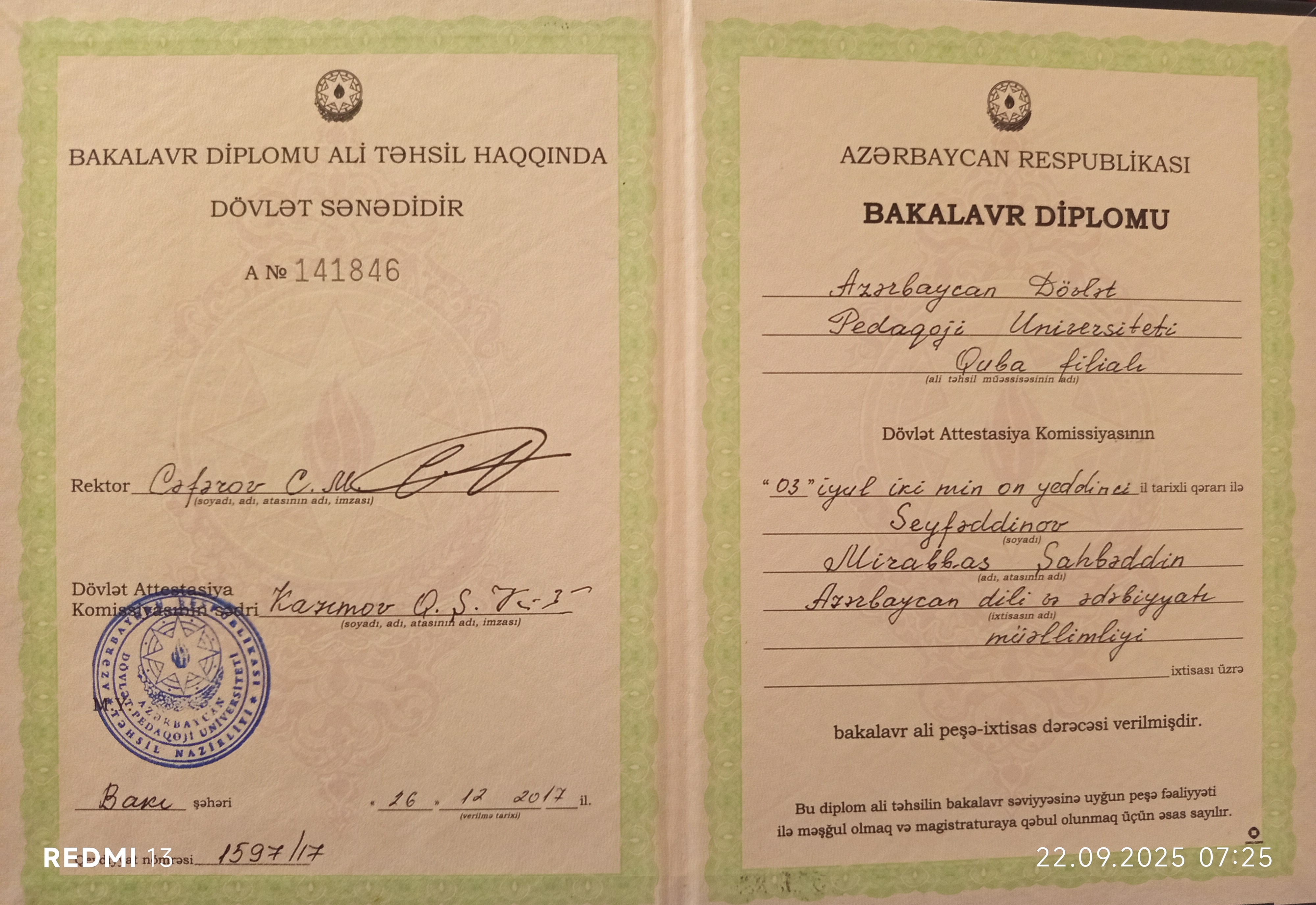 Mən Seyfəddinov Mirabbas Xaçmaz rayon Yalama kəndinin Azərbaycan dili və ədəbiyyat müəllimiyəm. 2018-ci ildən Repititor kimi fəalliyyətim mövcuddur. Həm Azərbaycan dilindən, həm də ədəbiyyat fənnindən hazırlıq mövcuddur. İlkin hazırlıq(V və VIII siniflər), buraxılış imtahanlarına hazırlıq və abituriyent hazırlığı istiqamətində tədris mövcuddur.