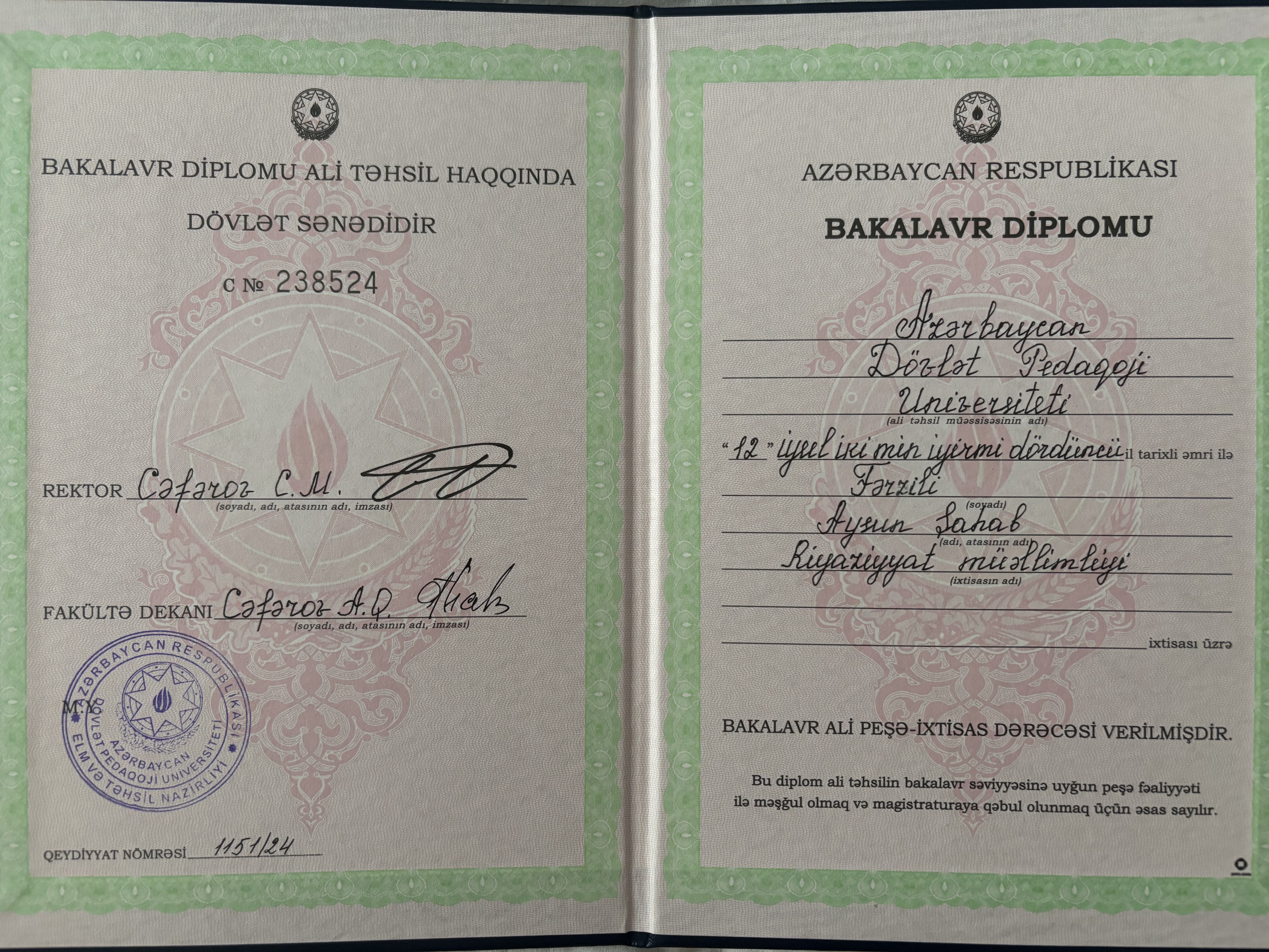Azərbaycan Dövlət Pedaqoji Universitetində bakalavr səviyyəsində Riyaziyyat müəllimliyi ixtisasını bitirmişəm. 2024-cü ildə Bakı Slavyan Universitetində Magistr səviyyəsinə qəbul olmuşam. 3,4 ildir şagirdlərə məşğələ hazırlıq keçirəm.Hal-hazırda online formada şagirdlərə dərslər keçirəm. 5-11-ci siniflərlə məşğul oluram.