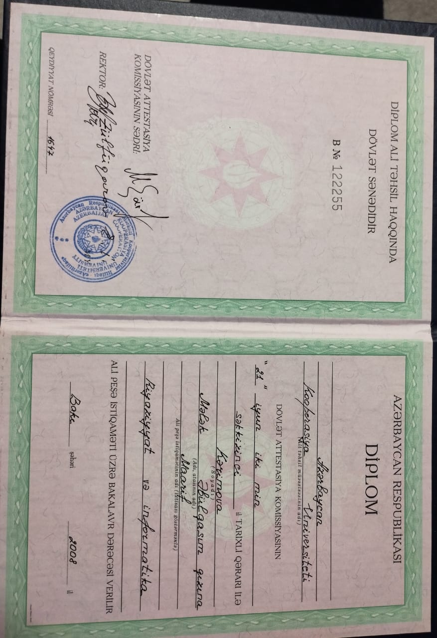 Azərbaycan Kooperasiya Universiteti Riyaziyyat-İnformatika ixtisası üzrə bakalavr diplomu