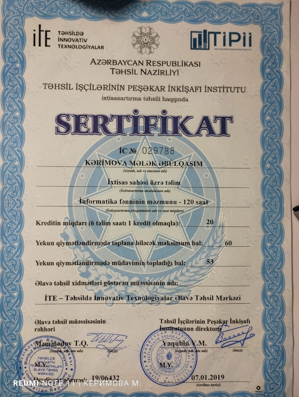 Təhsil İşçilərinin Peşəkar İnkişafı İnstitutu - İxtisas sahəsi üzrə Sertifikat
