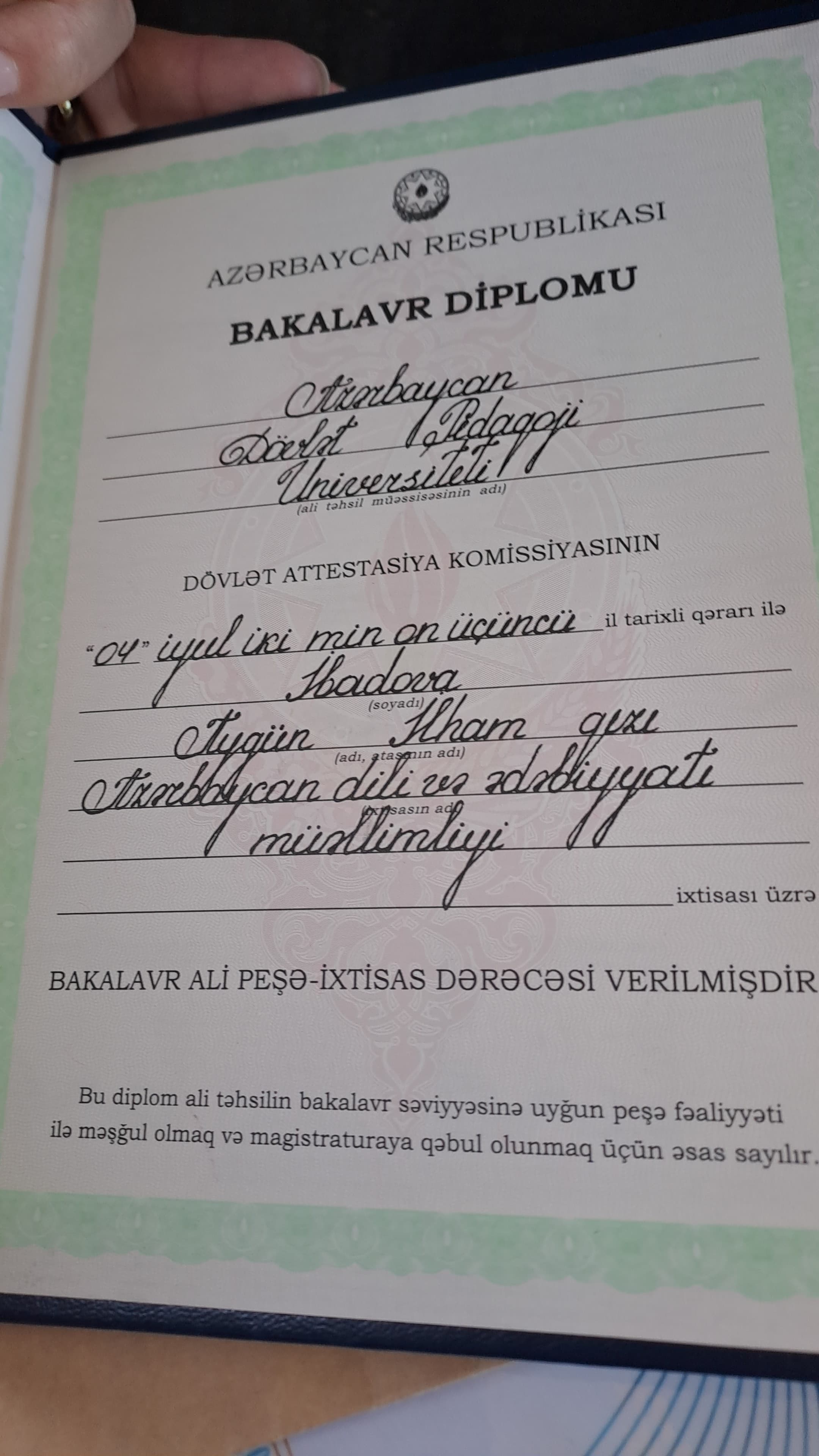 Universitet: Bakı şəhər Azərbaycan Dövlət Pedaqoji Universiteti Filologiya fakültəsi Azərbaycan dili və Ədəbiyyat müəllimliyi ixtisası -529 bal