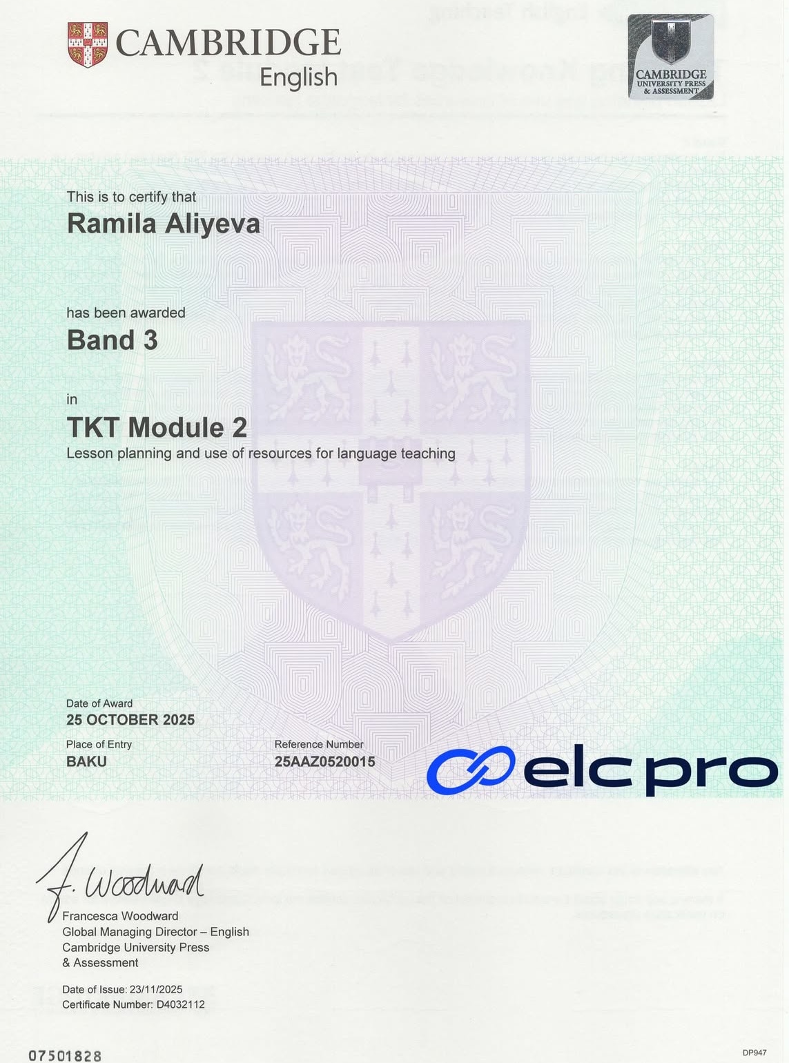 Cambridge TKT, признанный во всём мире, который подтверждает мои знания и навыки в преподавании английского. Мне важно делать уроки интересными, креативными и мотивирующими для каждого ребёнка.