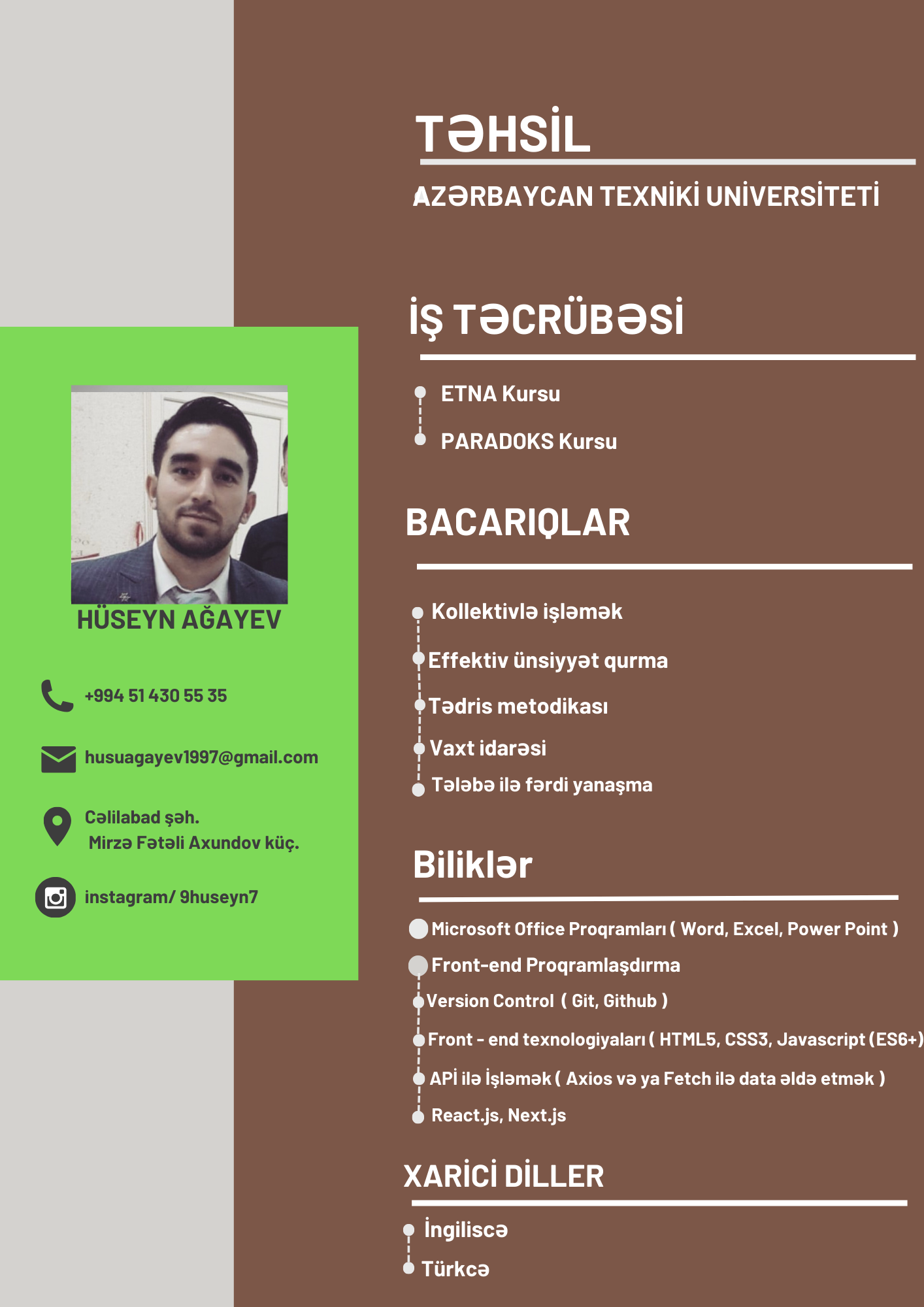 Salam! Mən Hüseyn, Front-End proqramçı və təlimçiyəm.