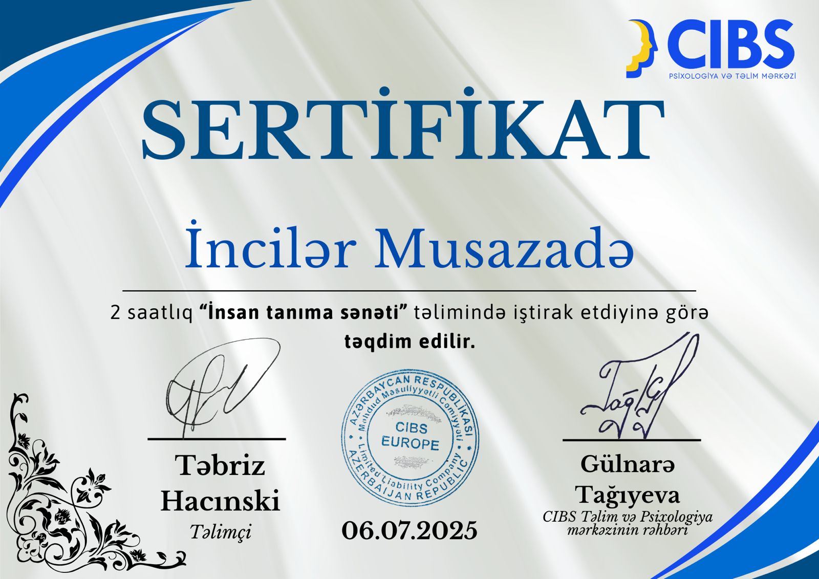 İNSAN TANIMA SƏNƏTİ üzrə sertifikat
