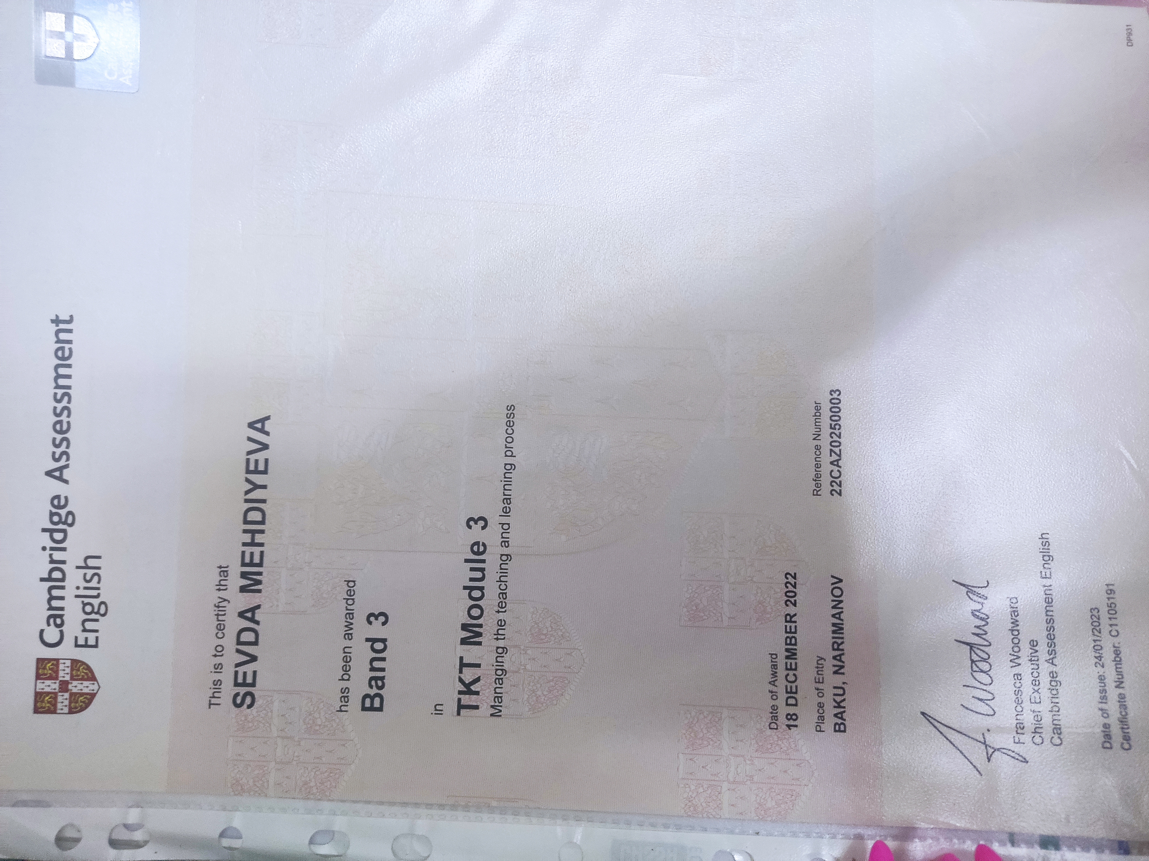 17 il təcrübəm var. Sertifikasiya balım56. Ayrıca CAMBRIDGE -ə aid olan rəsmi TKT sertifikatim var. Rus və ingilis dilini bilirəm. Xarici vətəndaşlara ingilis və rus dilində Azərbaycan dilini öyrədə bilərəm.Abituriyentlərlə işləyirm. Eyni zamanda 6-13 yaşlı uşaqlara ingilis dili dərsləri keçirə bilərəm