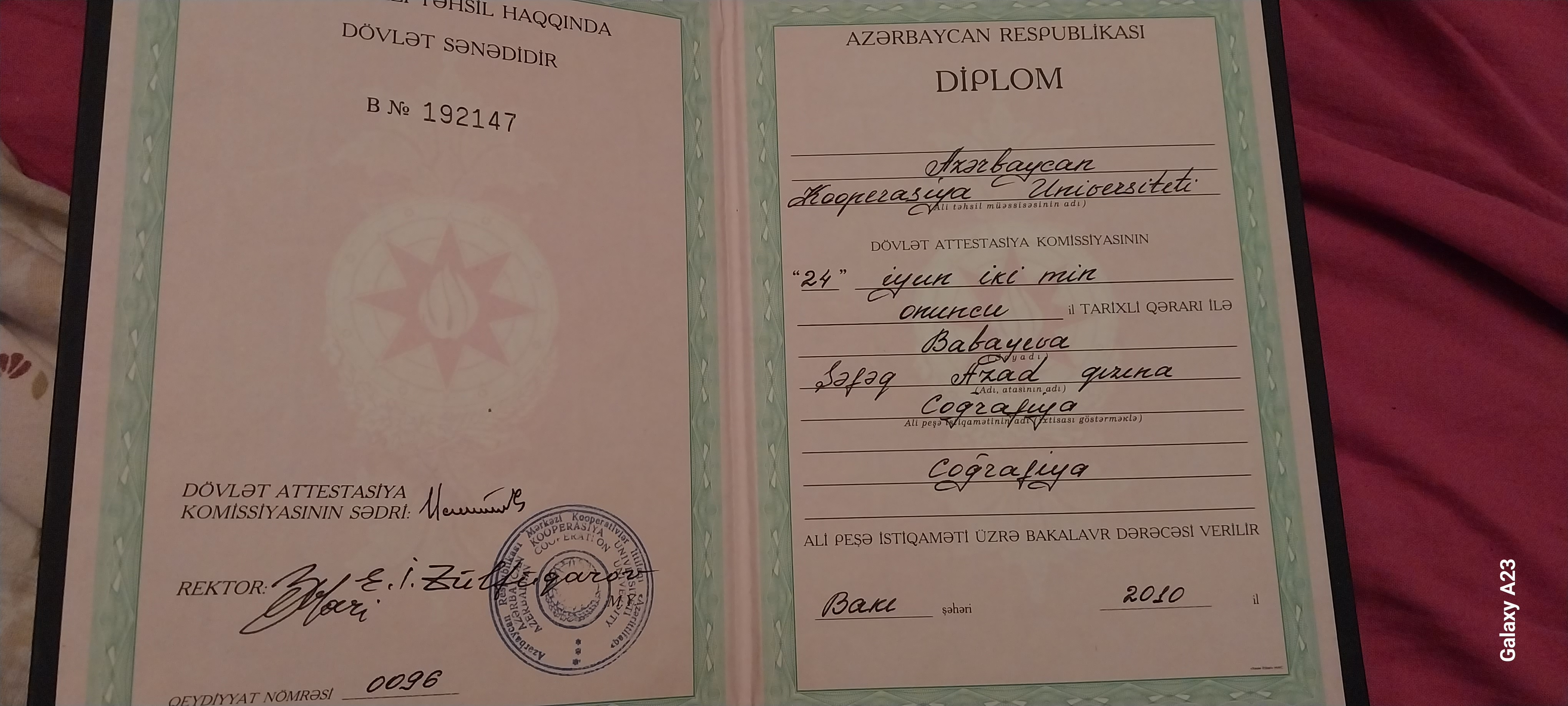 Mən Coğrafiya müəlliməsiyəm 17 illik müəllimlik təcrübəm var. Müellimlərin sertifikasiyası imtahanında 53 bal toplamışam ixtisasımdan 100 faiz neticə göstərmişəm. Həm Ağstafa şəhərində əyani dərslər keçirəm həm də online məşgələlər. Yüksək ballarla universitetlere qəbul olan şagirdlərim var. Coğrafiyanı asan dildə öyrənmək istəyənlər müraciət edə bilər. Məsələlər və xəritə üzərində işləməyə üstünlük verilir. Hər movzu sonunda yüksek seviyyəli sinaqlar islədilir və cavablar birbaşa valideylərə yönləndirilir.