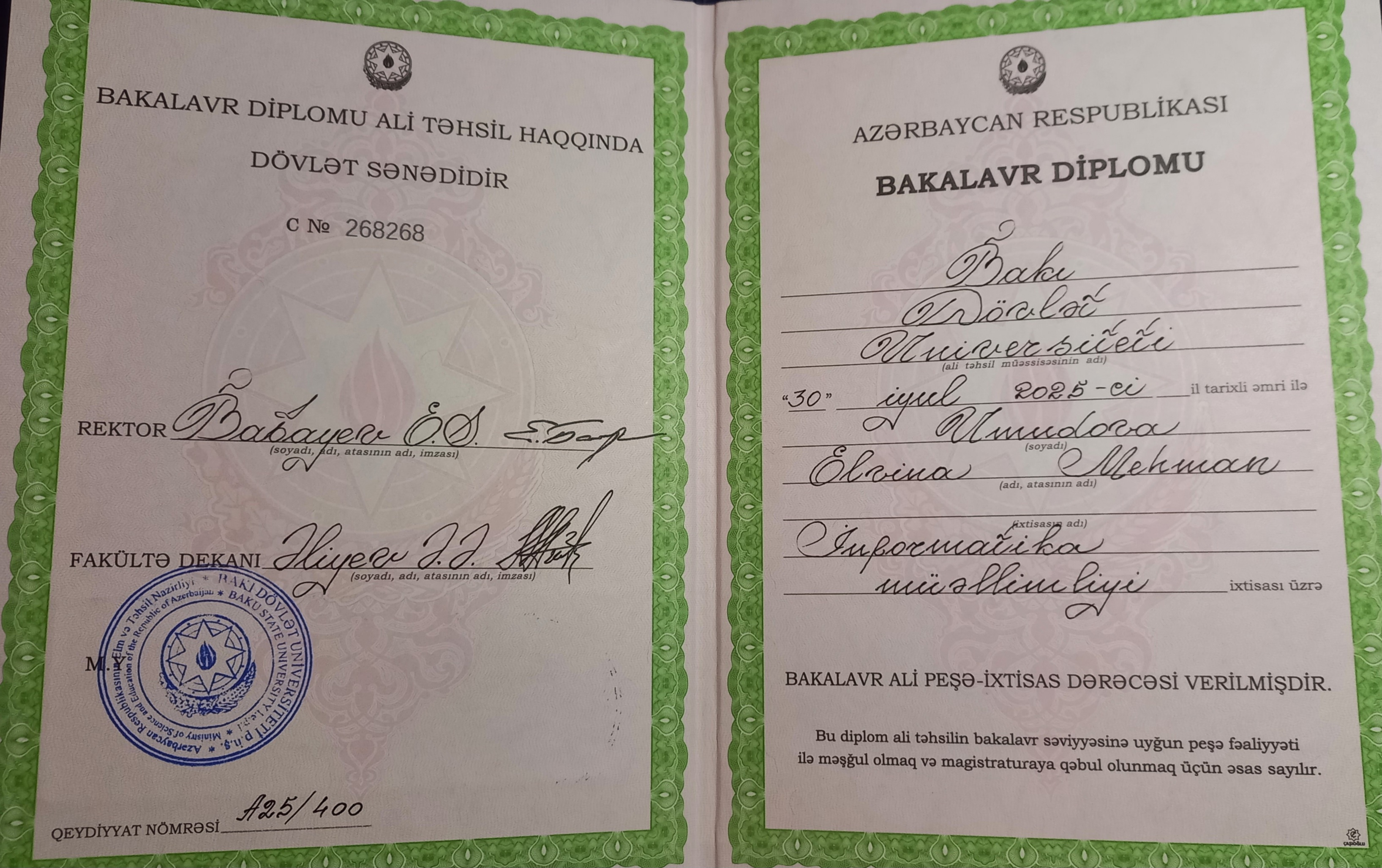 С 2021 года занимаюсь репетиторством. Преподавала математику и русский язык абитуриентам и обучала разговорному русскому языку. С 2023 по 2024 год работала в Esperanto Education. Получала педагогический опыт в школе №225 города Баку. С 2024 года преподаю математику в Elza Academy. Также являюсь преподавателем для абитуриентов в BELC tehsil kompleksi.