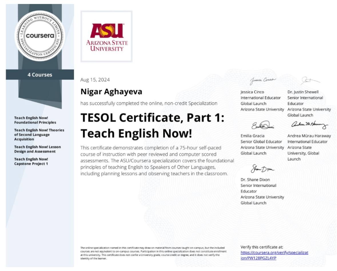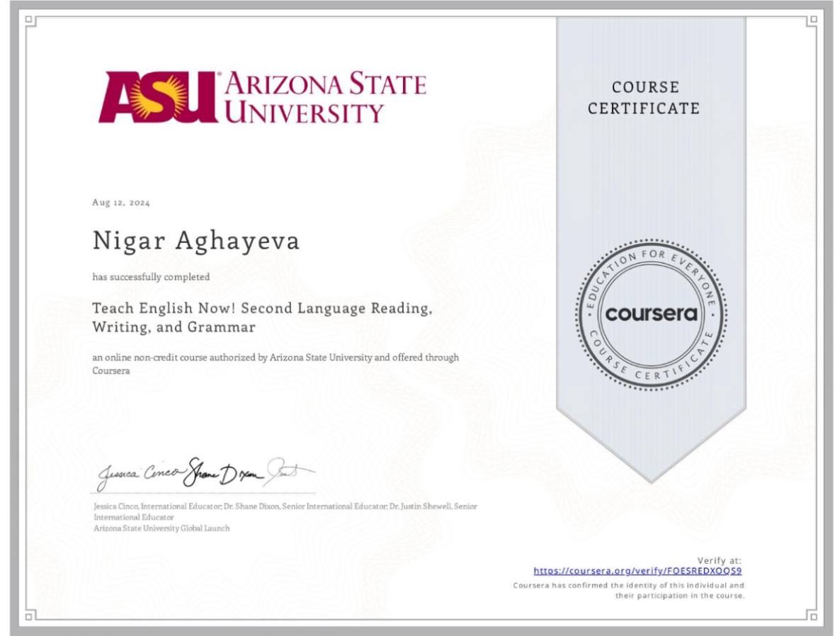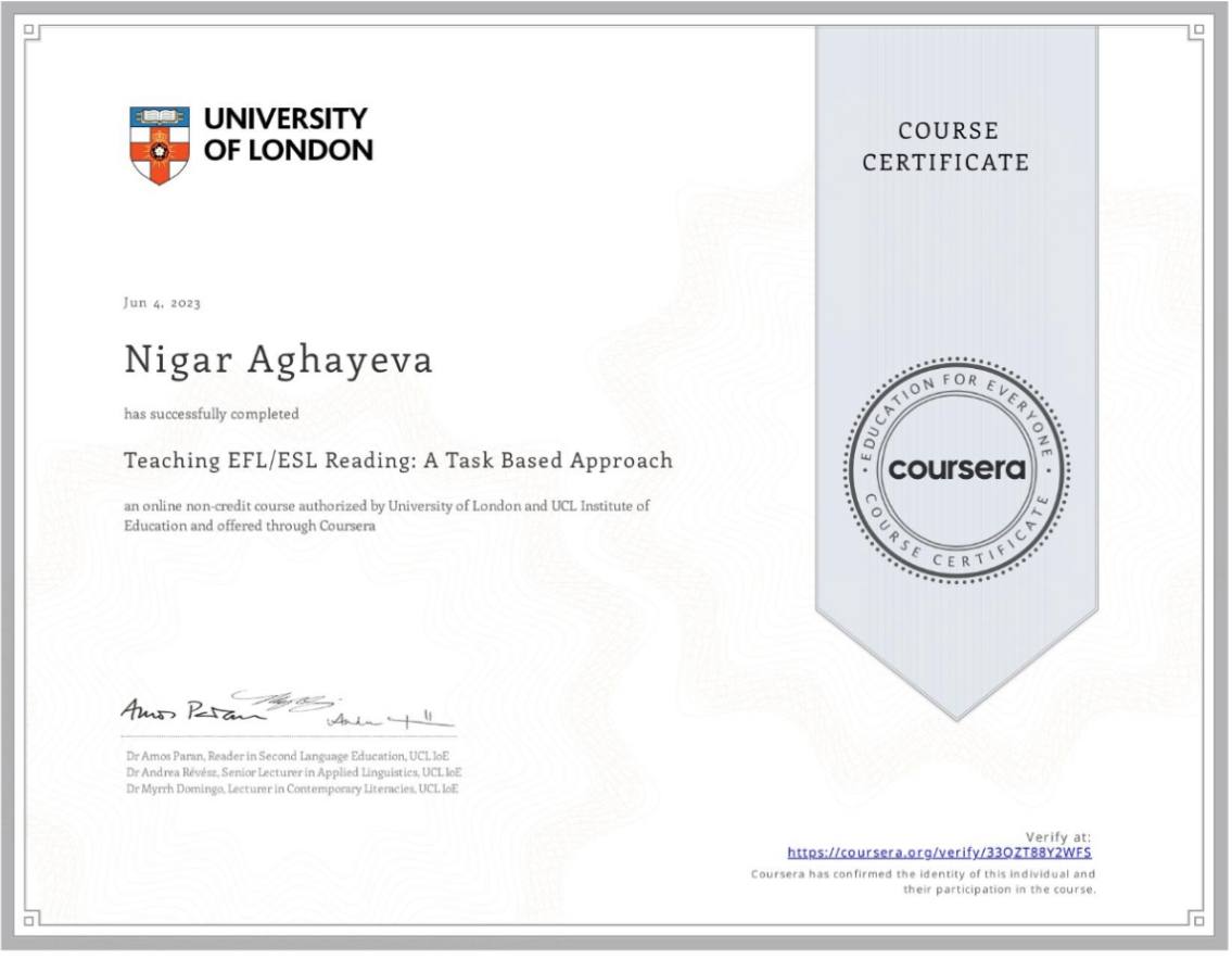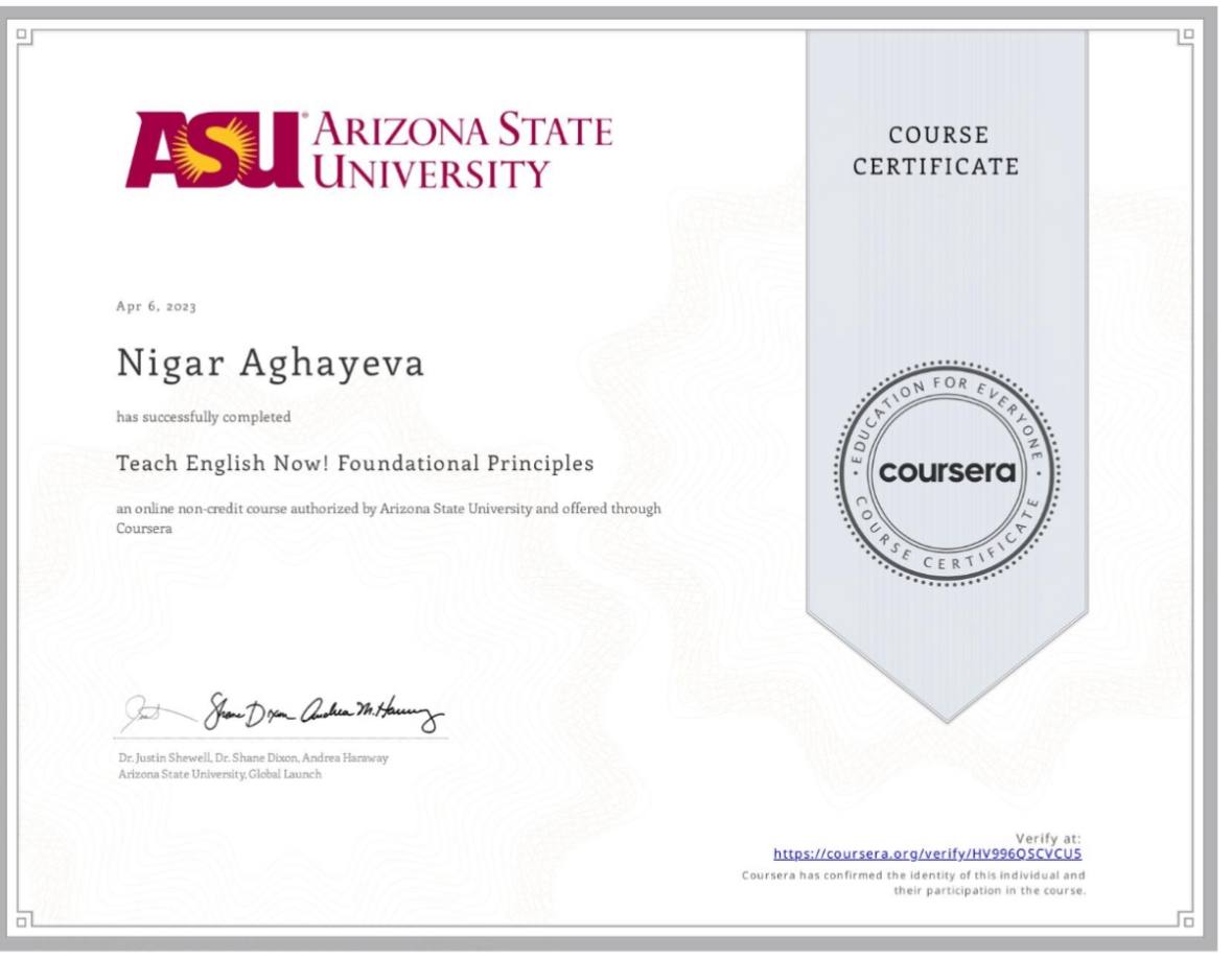 Azərbaycan Dillər Universitetində bakalavr və magistr pillələrində "İngilis dili müəllimi", "Dilşünaslıq" ixtisasları üzrə təhsil almışam. Bir sıra tədris mərkəzində fəaliyyət göstərmişəm. Arizona Dövlət Universitetindən TESOL beynəlxalq sertifikatını, həmçinin London universitetinin sertifikatını əldə etmişəm. Yerli ali məktəblərin birində ingilis dili müəllimi vəzifəsində çalışıram.