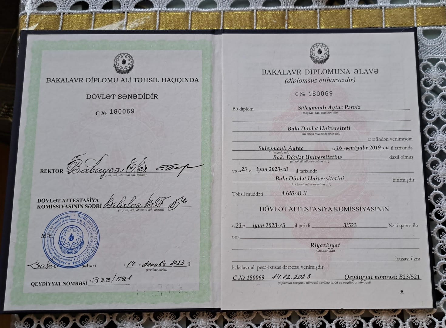 Bakalvr Bakı Dövlət universiteti Mexanika Riyaziyyat fakultəsi Riyaziyyat ixtisasını bitirmişəm. Magistr AzTu İT ixtisasını bitirmişəm. Təhsil aldığım müddətdə fərdi və qrup şəklində dərslər keçmişəm. Abituriyent hazırlığı, və 5-8 təkmilləşdirmə dərsləri.