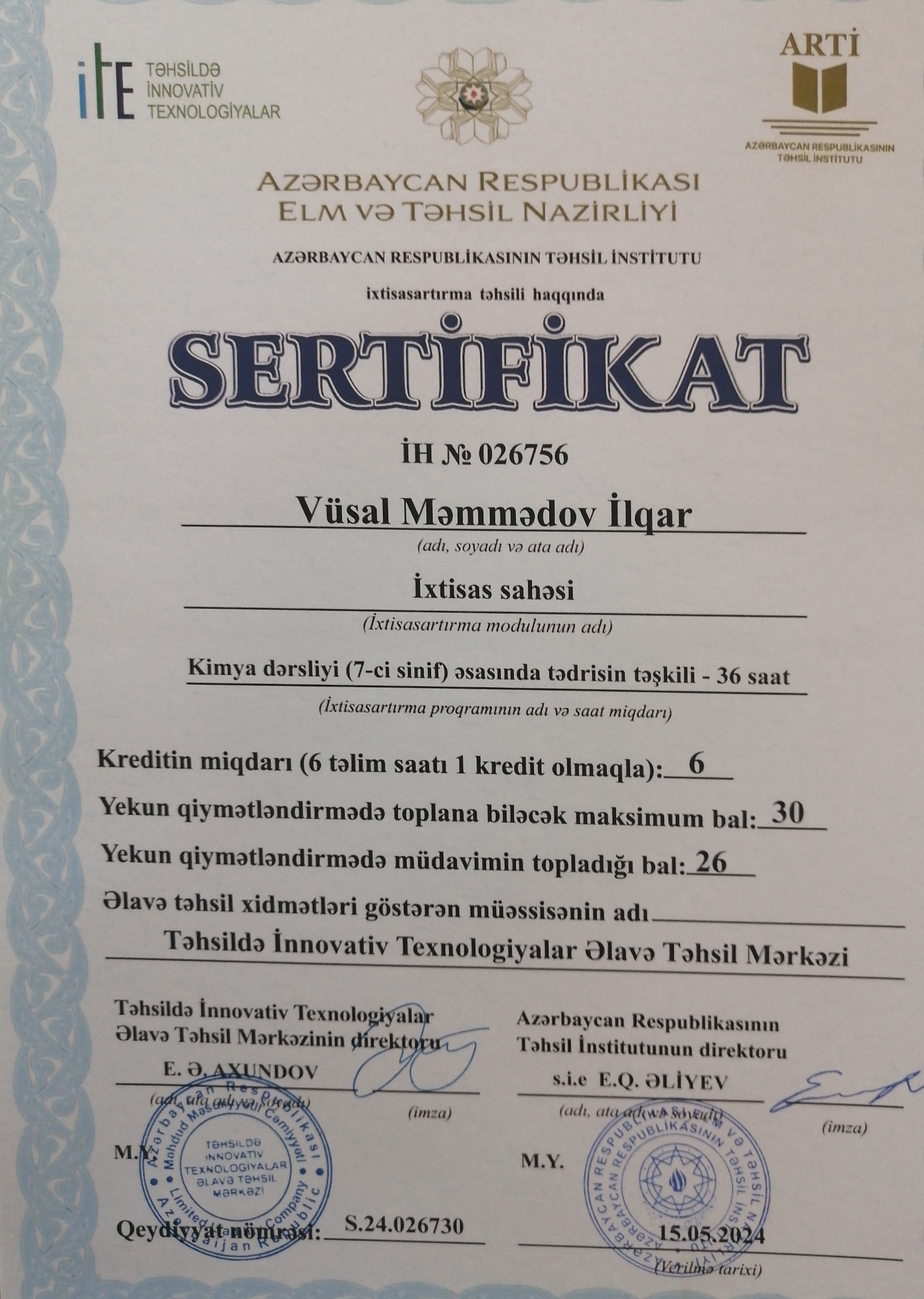 Deyerli insan, cox savadlı muellim. Size derin tesekkur edirem. Qizim Aydan sizin sayenizde Kimyaya xususi sevgisi yaranıb. Ve RFM sinaq imtahanından yuksək netice elde edib. Allah islerinizi avand elesin.