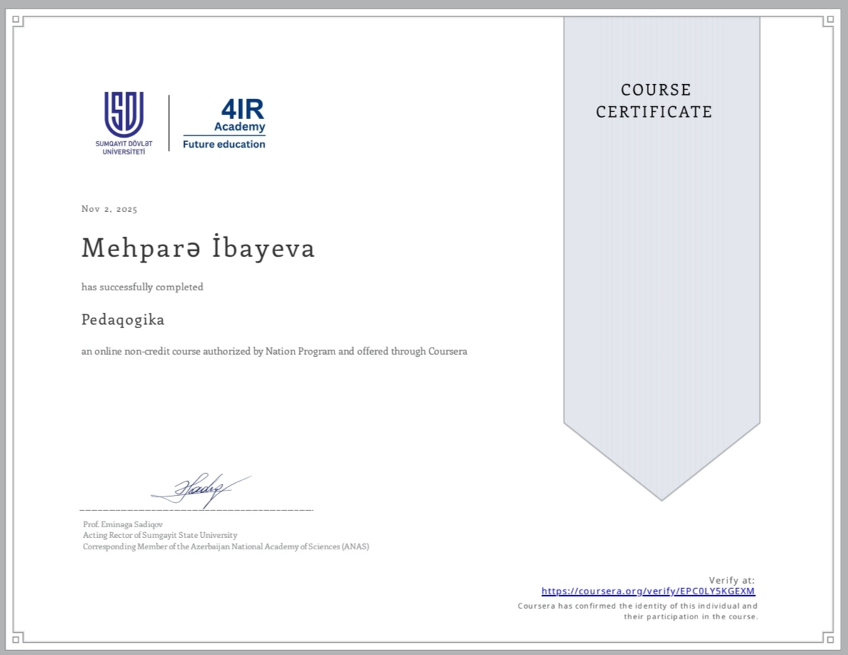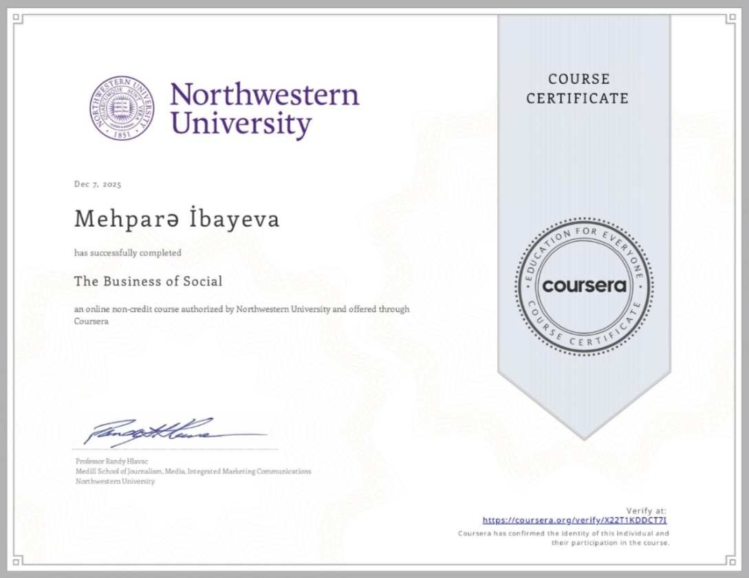 Northwestern Universetinin(ABŞ) rəsmi sertifikatı