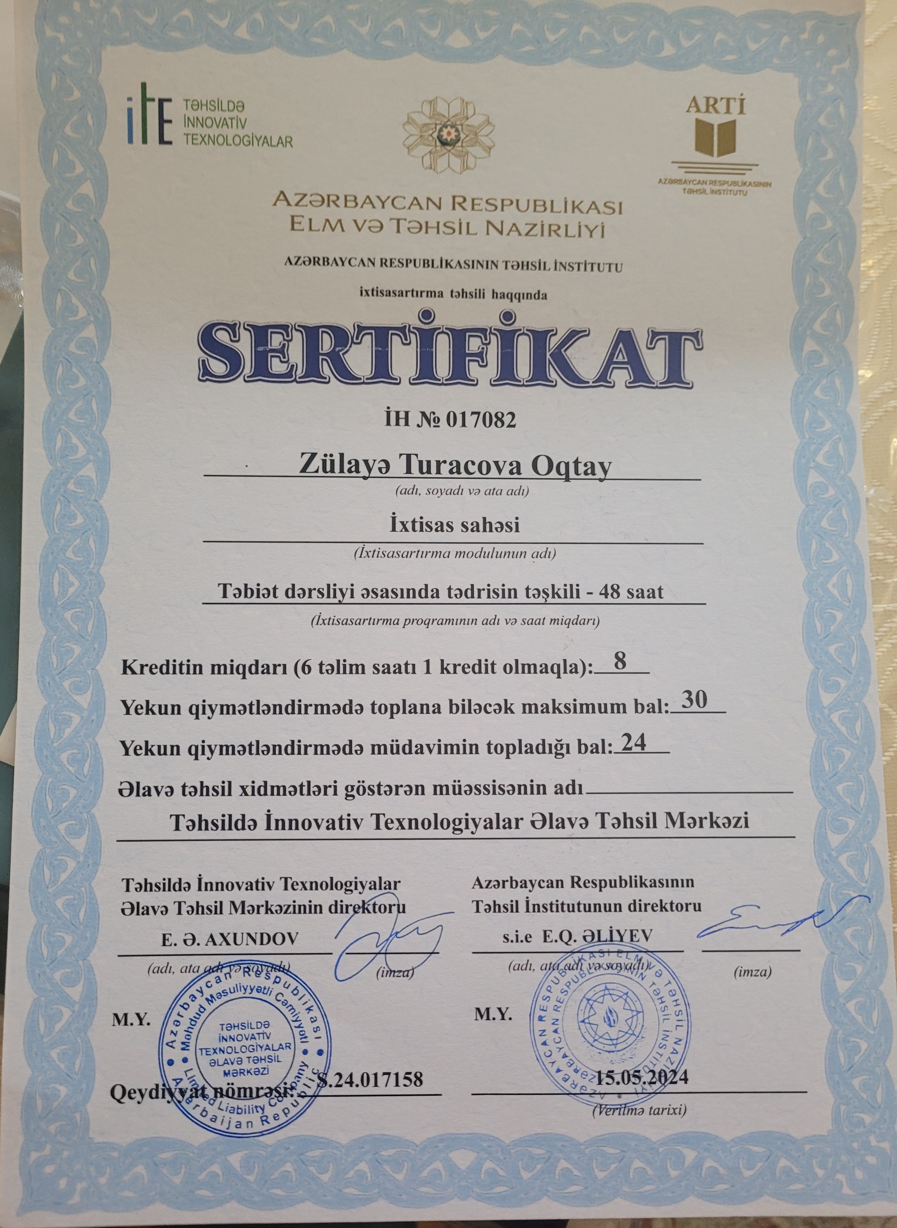 Салам. Я Мамедзаде Рейхан Фарруховна. Закончила и бакалавр, и магистр БГУ. Преподаю все 3 предмета 4ой группы: Биологию, Химию и Физика. Диплом соответствует. 1ое место работы Шушинская школа номер 1, а дальнейшее место работы частный лицей Зирве. Очень люблю свою профессию, т.к. люблю учеников, люблю их обучать и одновременно наслаждаюсь, когд