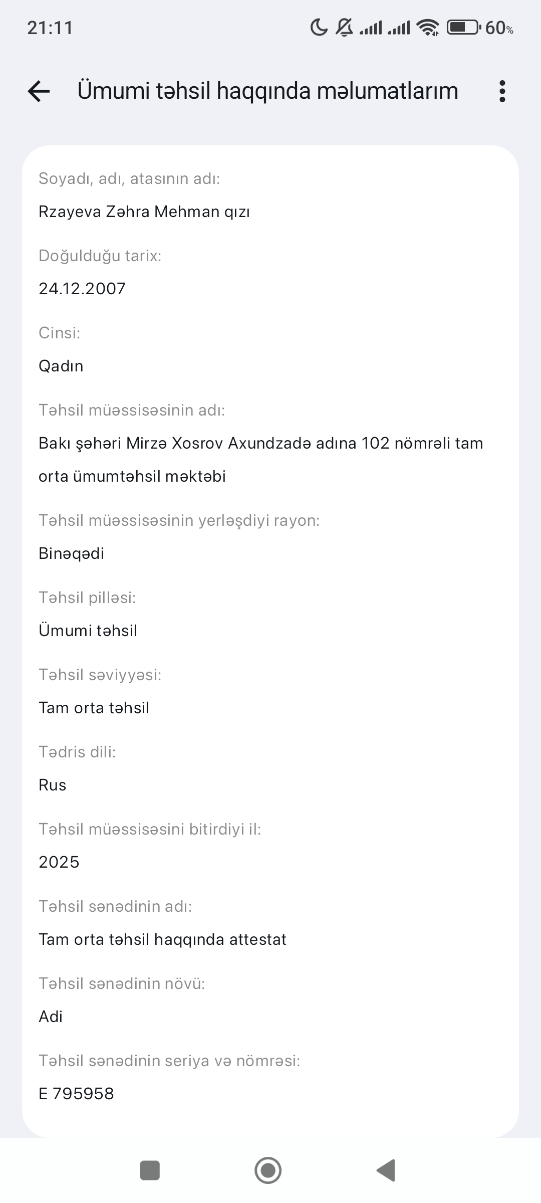 Bakalavr təhsilim Rus dili və ədəbiyyatı ixtisası üzrədir. 23 il ərzində həm rus dili və ədəbiyyatı tədrisi ilə həmdə ki, ibtidai siniflərdə tədrisin təşkili ilə məşğul olmuşam və kifayət qədər təcrübəm var. Bu dövr ərzində peşəkarlıq səviyyəmi yüksəltməkdən ötrü müxtəlif proqramlarda və layihələrdə iştirak etmişəm. Məktəbəqədər təhsil müəsiss