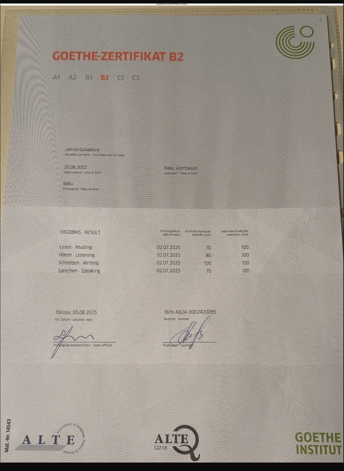 Mən Alman dili C1 sertifikatına sahibəm və Alman, İngilis dili və FSP tədris edirəm. Mən Türkiyə'də Alman dili və ədəbiyyatı təhsilimi 2018- ci ildə bitirdikdən sonra 4 il boyunca Almanya və Türkiyədə müəllim və tərcüməçi kimi işləmişəm. Artıq 6 illik Alman dili müəllimlik təcrübəm var. Əlavə olaraq həmçinin İngilis dilini də mükəmməl bir şəkildə d