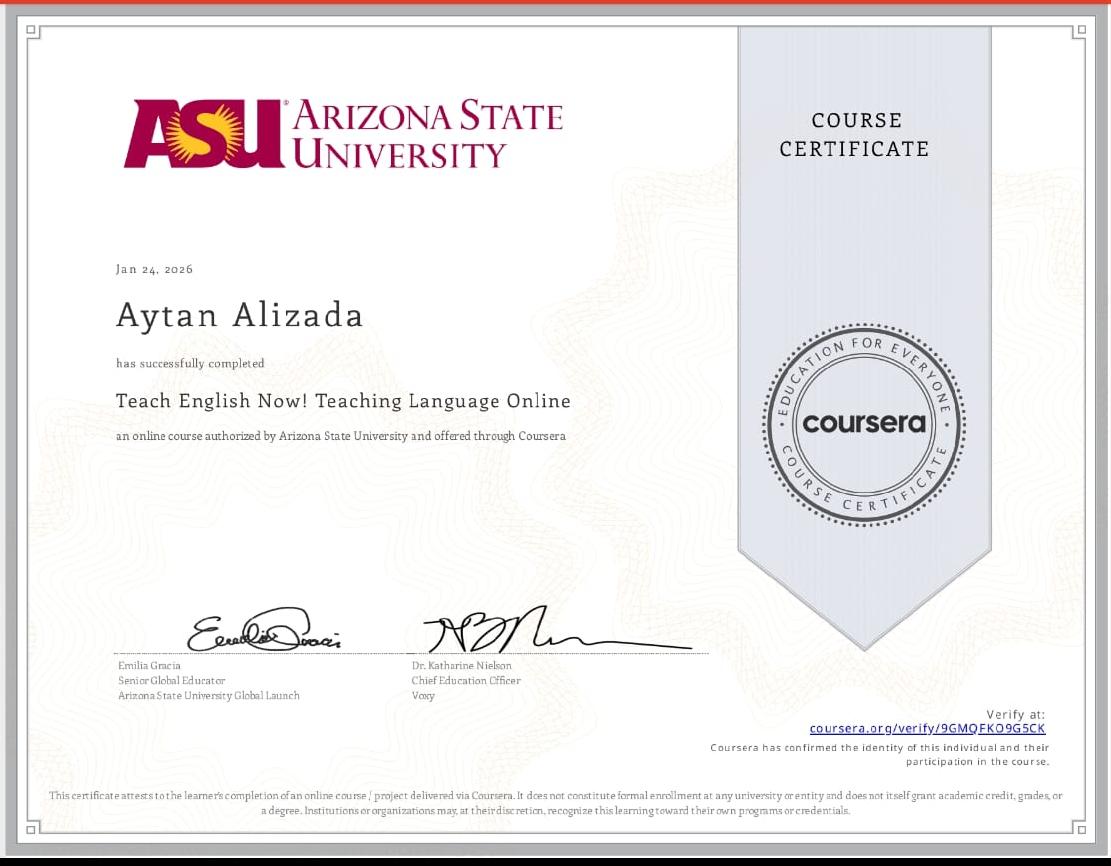 Mən Əlizadə Aytən, Azərbaycan Dillər Universitetinde Ingilis dili müəllimliyi ixtisası üzrə təhsil alıram və 2 ildir ki ingilis dili dərsləri keçirəm. Siniflər üzrə təkmilləşdirmə və general english dərsləri keçirilir. Dərslər online formatdadır və həm fərdi, həm qrup şəklində təşkil olunur. Sadəcə qrammatika və söz əzbərləmirik, dili danışaraq öyrənirik